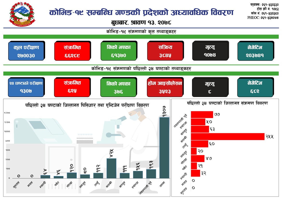 पोखरा, साउन १३ गते ।कोरोना संक्रमणबाट गण्डकी प्रदेशमा पछिल्लो २४ घण्टामा ८ जना संक्रमितको मृत्यु भएको छ । गण्डकी प्रदेशका विभिन्न अस्पतालमा उपचाररत ८ जनाको मृत्यु भएको हो ।