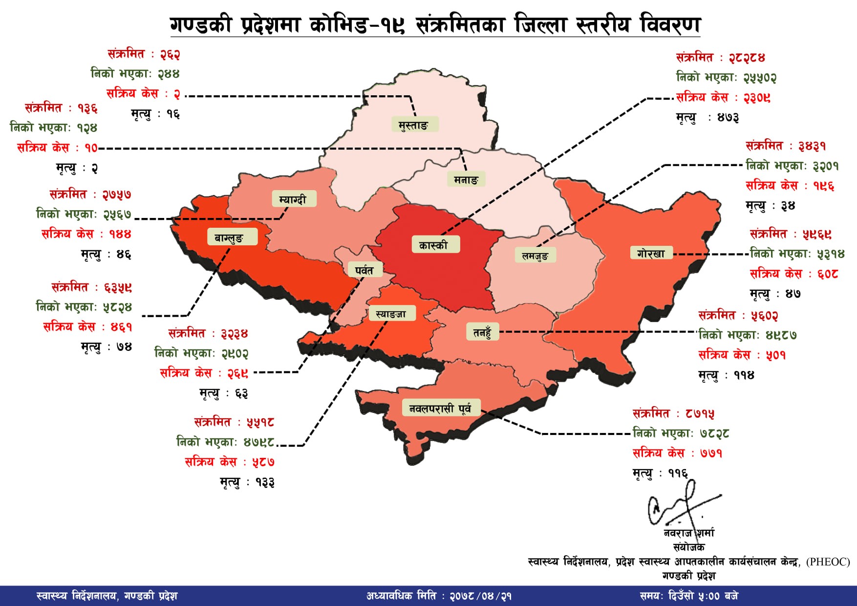 थपिएका मध्य कास्कीमा १९३ जनामा कोरोना भाइरस पुष्टि भएको प्रदेश स्वास्थ्य निर्देशनालय पोखराले जनाएको छ । त्यस्तै बाग्लुंगमा १ सय, म्याग्दीका ३७ जना, पर्वतका १३ जना, गोरखाका ४३ जना, लमजुङका १९ जना, तनहुँका २३ जना, स्याङ्जाका ७२ जना र नवलपुरका ७८ जना, मा सक्रमण पुष्टि भएको छ ।