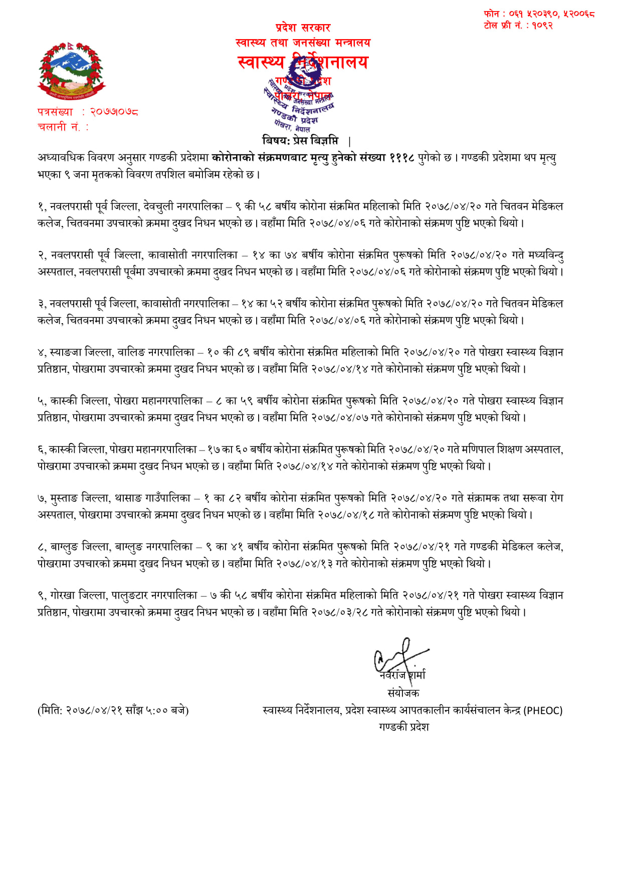 त्यस्तै पछिल्लो २४ घण्टामा गण्कडीमा कोरोना संक्रमित ९ जनाको मृत्यु भएको छ । गण्डकी प्रदेशका विभिन्न अस्पतालमा उपचाररत ९ जनाको मृत्यु भएको स्वास्थ्य निर्देशनालयले जनाएको छ ।मृत्यु हुनेमा नवपरासी ३ जना, कास्की २ जना, गोरखा १ जना, स्यांजा १ जना, बाग्लुग १ जना र मुस्तांगका १ जनाको मृत्यु भएको छ ।