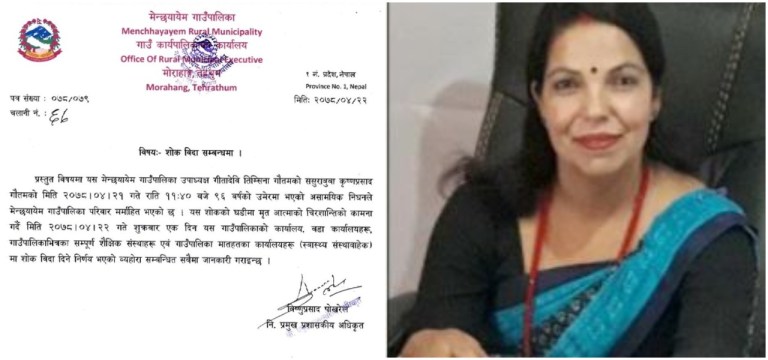 काठमाडौं, साउन २२ । तेह्रथुमको मेन्छयायेम गाउँपालिकाले उपाध्यक्षका ससुराको निधनमा शुक्रबार शोक बिदा दिएको छ । गाउँपालिकाकी उपाध्यक्ष गीतादेवी तिम्सिना गौतमका ससुरा कृष्णप्रसाद गौतमको बिहीबार राति ११ः४० बजे निधन भएको थियो । गाउँपालिकाका निमित्त प्रमुख प्रशासकीय अकिकृत विष्णुप्रसाद पोखरेलले शुक्रबार सूचना जारी गरी शोक बिदाको जानकारी गराउनुभएको हो ।
