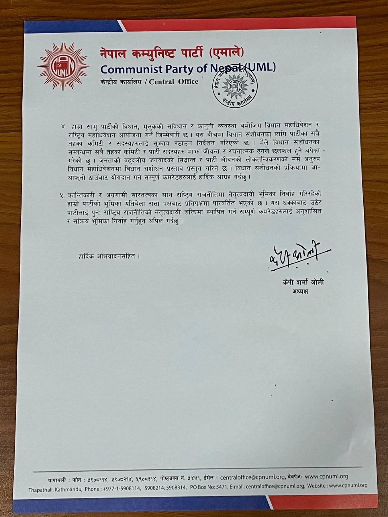 सोमबार आफ्नो निवास बालकोटमा पार्टीका नेताहरुसँग छलफल गरेपछि ओलीले विज्ञप्ति जारी गरेका हुन् । राजनीतिक दलसम्वन्धि विधेयक अध्यादेशमार्फत ल्याउने तयारीसहित आज संसद अधिवेसन अन्त्य गरिएको थियो ।
