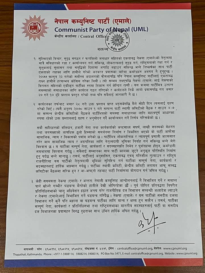 ओलीले विज्ञप्तिमा भनेका छन्, ‘पार्टीका सम्पूर्ण नेता, कार्यकर्ता र प्रतिनिधिसभा तथा राष्ट्रिय सभाका माननीय सदस्यहरुलाई पार्टी वा संसदीय दल विभाजनका प्रयासहरु विरुद्ध दृढताका साथ उभिन हार्दिक अपिल गर्दछु ।’