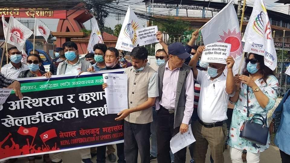 पोखरा, भदौ २ गते ।राजनीतिक दल सम्बन्धि ल्याइएको अध्यादेश को विरोधमा नेपाल खेलकुद महासंघले राजधानीमा विरोध सभा सम्पन्न गरेको छ ।त्रिपुरेश्वोर स्थित दशरथ रंगशालाको गेट अगाडि भेला भएका खेलाडी तथा नेकोसका नेताकार्यकर्तालाई अध्यक्ष रमेशकुमार पौडेलले सम्बोधन गरेका थिए ।