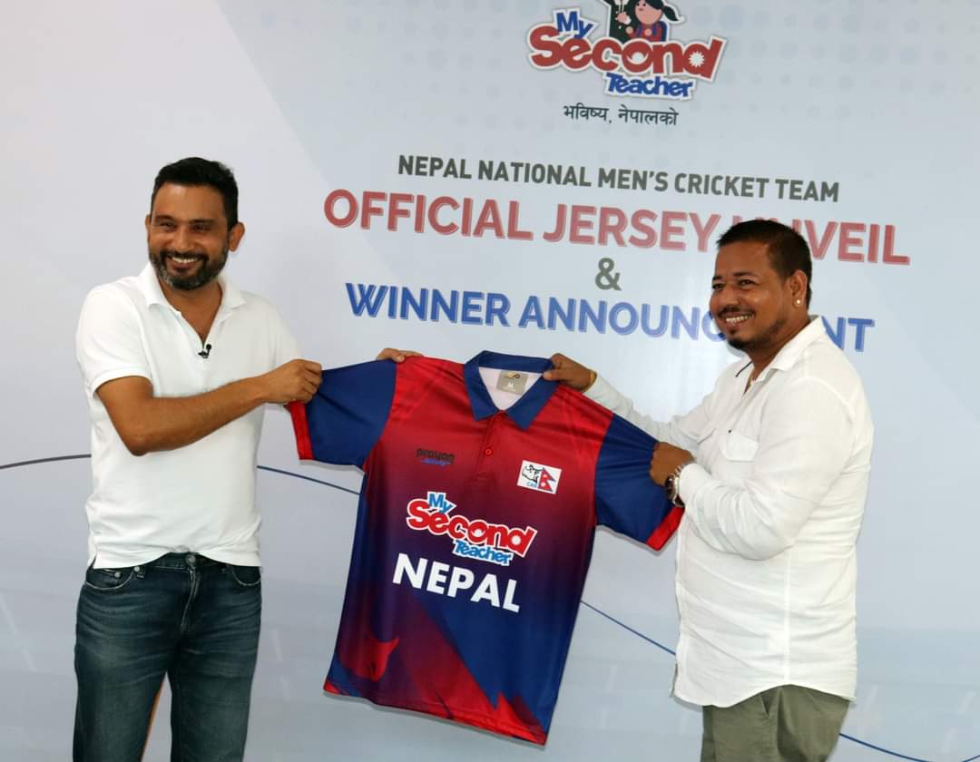 रातो र नीलो रङ्गको जर्सीको देब्रपट्टीमाथि नेपाल क्रिकेट संघको लोगो र नेपालको राष्ट्रिय झण्डा अङ्कित गरिएको छ । जर्सीको प्रायोजक ‘माइ सेकेण्ड टिचर’ मध्य भागमा लेखिएको छ भने मुनि नेपाल लेखिएको छ ।