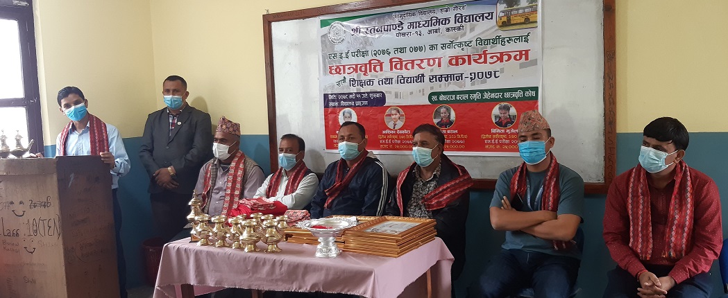 पोखरा, भदौ १२ गते । पोखरा महानगरपालिका वडा नं १३ स्थित रतन पाण्डे माध्यमिक विद्यालयमा २०७६ र २०७७ को एसइई परीक्षामा प्रथम तथा द्वितीय स्थान प्राप्त गर्ने विद्यार्थीलाई एक कार्यक्रमकाबीच सम्मान गरिएको छ ।
