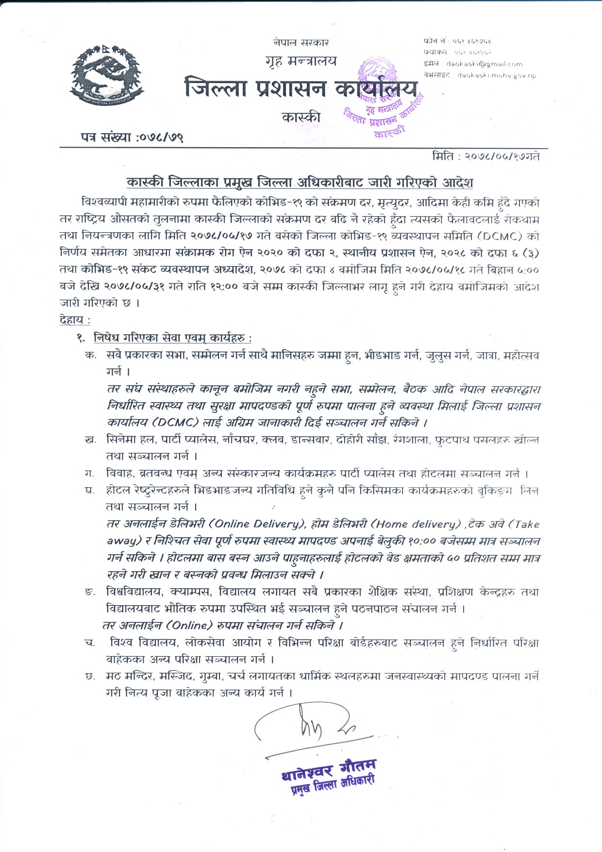 पोखरा, भदौ १७ गते । कास्कीमा फेरी निषेधाज्ञा थप गरिएको छ । भदौ १८ देखि ३१ गते राती १२ बजे सम्म लागु हुने गरी निषेधाज्ञा थप गरिएको हो । जिल्ला प्रशासन कार्यालय कास्कीले बिहिबार साँझ निषेधाज्ञा सम्वन्धि आदेश जारी गदै यसघि लागु गरिएको जोर विजोर प्रणाली हटाएको छ ।