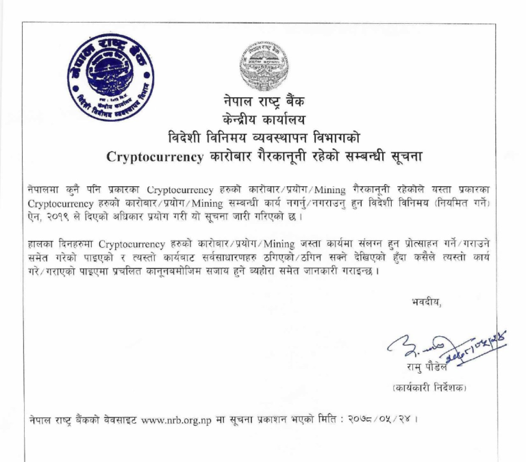 सूचनामा भनिएको छ, ‘हालका दिनहरुमा क्रिप्टोकरेन्सीहरुको कारोबार/प्रयोग/माइनिङजस्ता कार्यमा संलग्न हुन प्रोत्साहन गर्ने/गराउने समेत गरेको पाइएको र त्यस्तो कार्यबाट सर्वसाधारणहरु ठगिएको/ठगिन सक्ने देखिएको हुँदा कसैले त्यस्तो कार्य गरे/गराएको पाइएमा प्रचलित कानुनबमोजिम सजाय हुने व्यहोरा समेत जानकारी गराइन्छ ।’