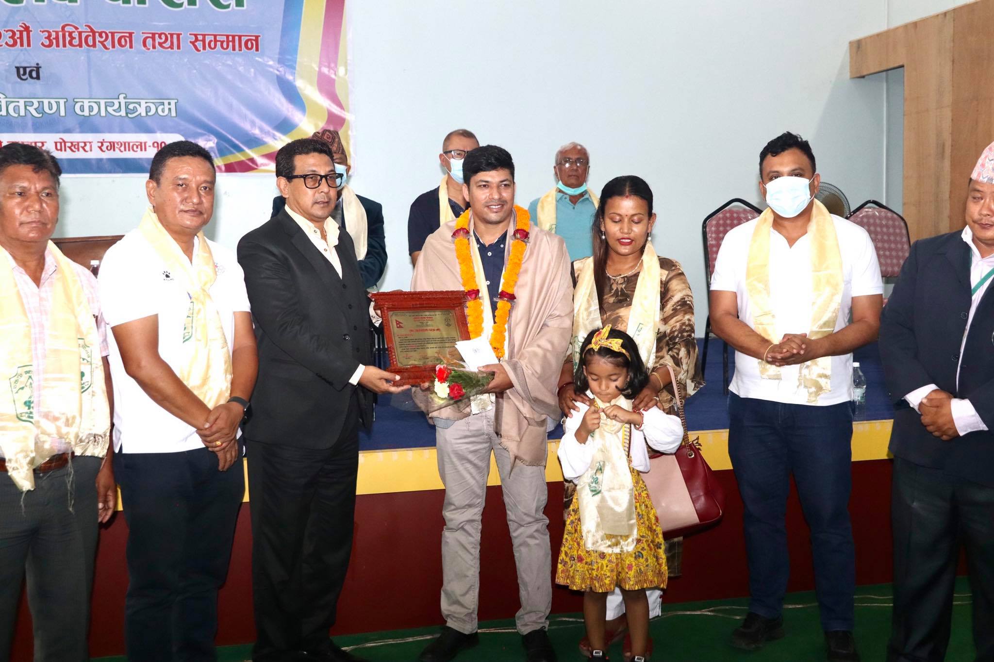 गण्डकी प्रदेशका युवा तथा खेलकुदमन्त्री राजीव गुरुङ, गण्डकी प्रदेश खेलकुद परिषदका सदस्यसचिव तेजबहादुर गुरुङ र सहारा क्लबका केशबबहादुर थापाले नगद २० हजार ५ सय ५५ रुपियाँ, सम्मानपत्र, दोसल्लाले सम्मान गर्नुभयो ।