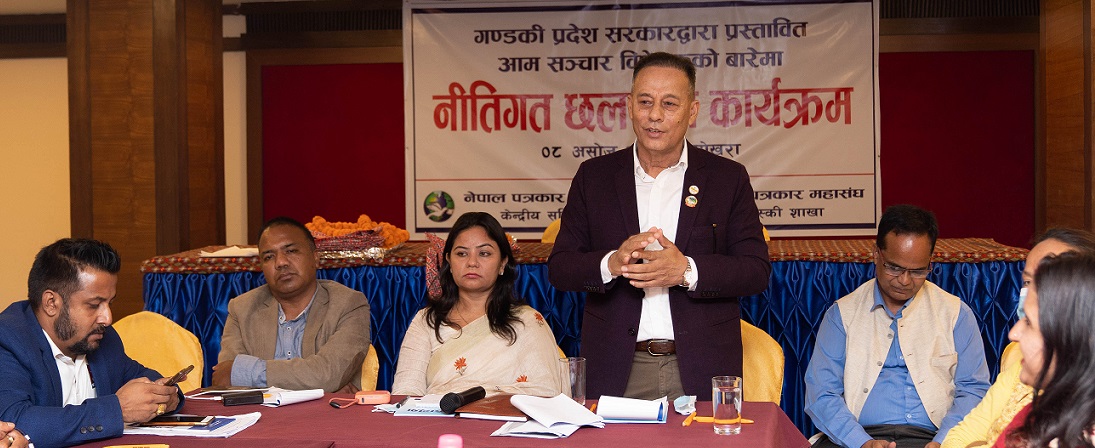 पोखरामा आमसंचार विधेयकउपर नीतिगत छलफल पोखरा । पोखरामा आमसंचार विधेयकउपर नीतिगत छलफल भएको छ । नेपाल पत्रकार महासंघ केन्द्रीय समिति र नेपाल पत्रकार संघ कास्कीले गण्डकी प्रदेश सरकारद्वारा प्रस्तावित आमसञ्चार विधेयकको बारेमा नीतिगत छलफल गरेको हो । कार्यक्रममा बोल्दै पत्रकार महासंघ केन्द्रका वरिष्ठ उपाध्यक्ष रमेश विष्टले तीन तहको सरकारले संचार विधेयकका विषयमा गतिलो गृहकार्य गर्न नसकेको बताए ।