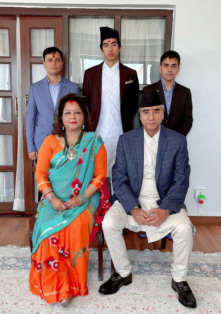 प्रधानमन्त्री देउवाले सामान्य रुपमै परिवारका सदस्यहरुसँग टीका लगाएर दशैँ मनाएका हुन् । तस्वीरमा प्रधानमन्त्री श्रीमती आरजु र छोरा छोरा जयविरसिंह देउवा देखिएका छन् । साथमा प्रधानमन्त्रीका प्रमुख स्वकीय सचिव तथा भतिजा भानु देउवा र प्रकाश देउवा रहेका छन् ।