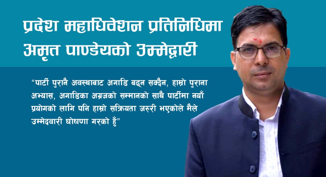 काठमाडौं– नेपाल विद्यार्थी संघका नेता अमृत पाण्डेयले आसन्न नेपाली कांग्रेसको १४ औं महाधिवेशनमा आफूलाई प्रदेश प्रतिनिधिको रुपमा उभ्याउने भएका छन्।