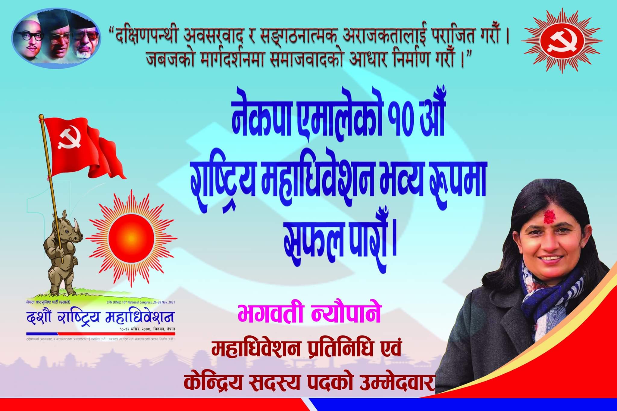 पोखरा,मंसिर ९ गते । नेकपा एमालेकी नेतृ भगवती न्यौपानेले नेकपा एमालेको केन्द्रीय सदस्यको उम्मेदवारी दिने हुनुभएको छ । राष्ट्रिय सभा सदस्य समेत रहनुभएकी न्यौपानेले चितवनमा सम्पन्न हुन गईरहेको पार्टीको दशौं राष्ट्रिय महाधिवेशनमा महिला कोटाबाट केन्द्रीय सदस्यमा उठ्ने घोषणा गर्नुभएको हो  ।