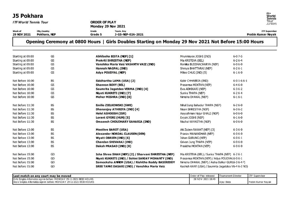 मंगलबार भएको खेलमा नेपाली खेलाडीहरुले राम्रो खेल प्रर्दशन गरेका छन् । उद्घाटन खेलमा नेपाली नम्वर एक खेलाडी अविलाषा विष्ट र प्रकृति श्रेष्ठले जित दर्ता गरेका छन् । दुवै जनाले विदेशी खेलाडीलाई हराउदै जित दर्ता गरेका हुन् । अविलाषाले भारतीय खेलाडी मुरम्यायीन जोशीलाई ६े–० र ७े–५ को सेटमा पराजित गरिन् । त्यस्तै प्रकृति श्रेष्ठले बेल्जियकी माक्रिस्टिभलाई ६े–२ र ६े–४ ले हराउदै जित दर्ता गरिन् ।