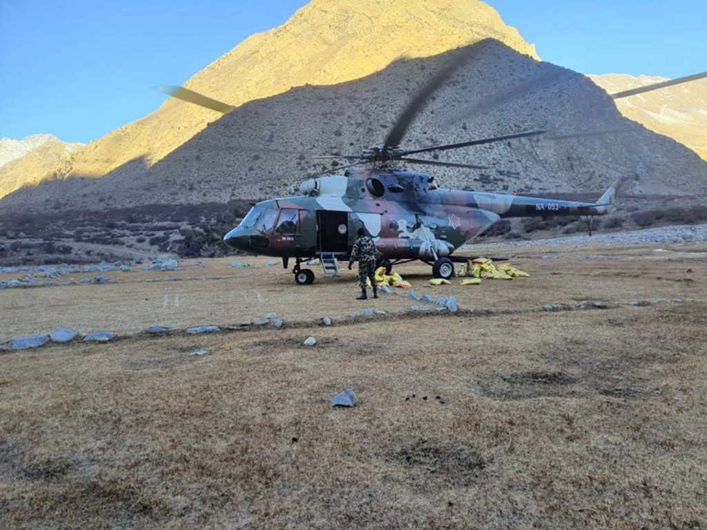 हुम्लाको उत्तरी नाम्खा गाउँपालिका–६ लिमीमा ७८ क्विन्टल खाद्यान्न ढुवानी गरिएको छ । नेपाली सेनाको हेलिकोप्टरबाट खाद्यान्न अभाव भएको लिमीमा सोमबारदेखि खाद्यान्न ढुवानी थालिएको हो ।