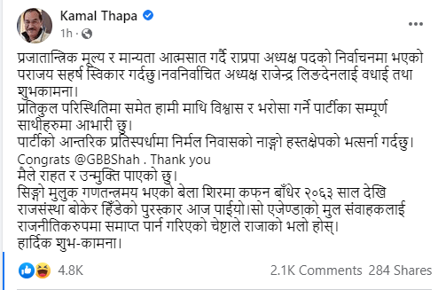 नवनिर्वाचित अध्यक्ष राजेन्द्र लिङदेनलाई वधाई तथा शुभकामना । उनले प्रतिकुल परिस्थितिमा समेत हामी माथि विश्वास र भरोसा गर्ने पार्टीका सम्पूर्ण साथीहरुमा आभारी छु भनेका छन् । उनले निर्मल निवासले हस्तक्षेप गरेका गरेको भन्दै भत्सना समेत गरेका छन् । उनले लेखेका छन् पार्टीको आन्तरिक प्रतिस्पर्धामा निर्मल निवासको नाङ्गो हस्तक्षेपको भत्सर्ना गर्दछु।