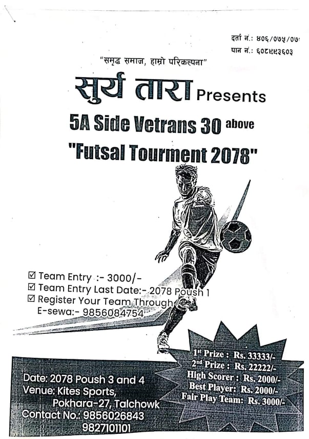 पोखरा, मंसिर २३ गते । सुर्य तारा क्लब (पोखरा)पोखरा २७ गण्डकी प्रदेश नेपालको आयोजनामा “फाइएभ ए साइड भेट्रान्स फुटसल प्रतियोगिता २०७८” आयोजना हुने भएको छ । पुस पहिलो साता पोखरामा प्रतियोगिता गर्न लागेको क्लबका अध्यक्ष विष्णु पुनले जानकारी दिए । प्रतियोगिता पुस ३ र ४ गते लेखनाथमा सञ्चालन हुने भएको छ ।