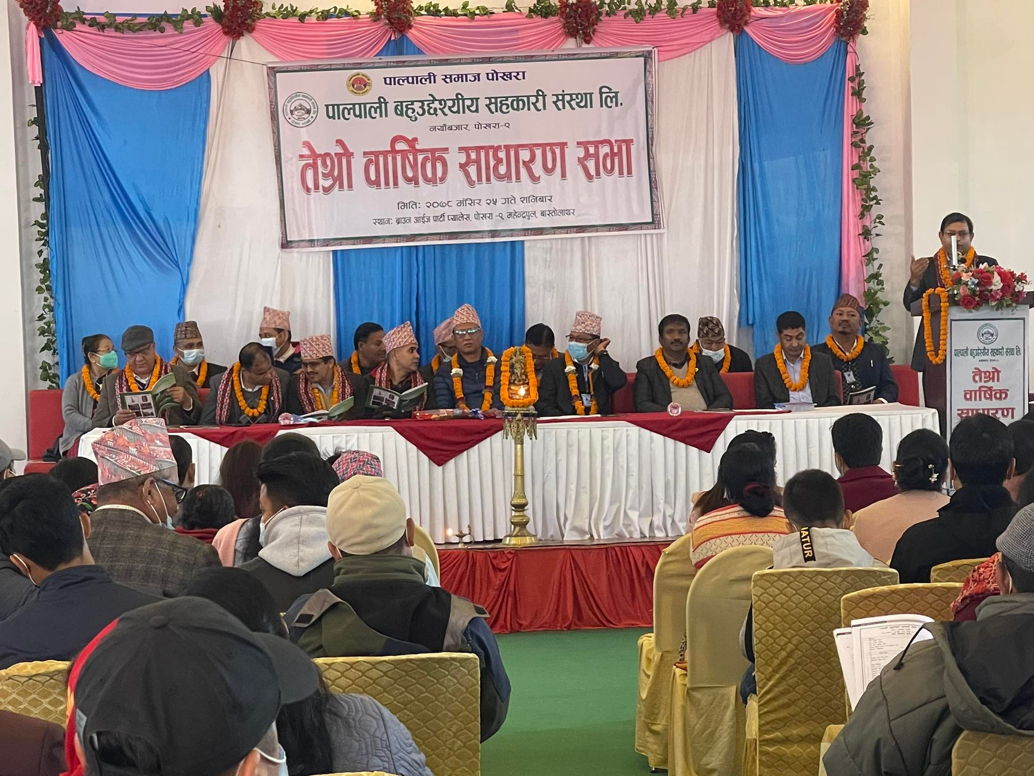 पोखरा, मंसिर २५ गते ।पाल्पाली बहुउद्देश्यीय सहकारी संस्था लिमिटेडको शनिबार तेस्रो वार्षिक साधारण सभा सम्पन्न भएको छ ।पोखरा महानगरपालिका सहकारी विभागका दर्ता अधिकृत अनिल कार्कीले सभाको उद्घाटन गर्दै सहकारीका सिद्धान्तमध्ये स्वायत्तता र स्वतन्त्रता बढी महत्वपूर्ण रहेको चर्चा गरे । उनले महानगरमा दर्ता भएका सहकारीले ५ लाखसम्मको उत्पादनमूलक कार्यक्रमका लागि ५० प्रतिशत अनुदान दिन थालेको जानकारी दिए । उनले त्यस्तो अनुदान लिन सबै सहकारीलाई आग्रह गरे । उनले पाल्पाली सहकारीले सन्तोषजनक काम गरेको भन्दै प्रशंसा गरे ।