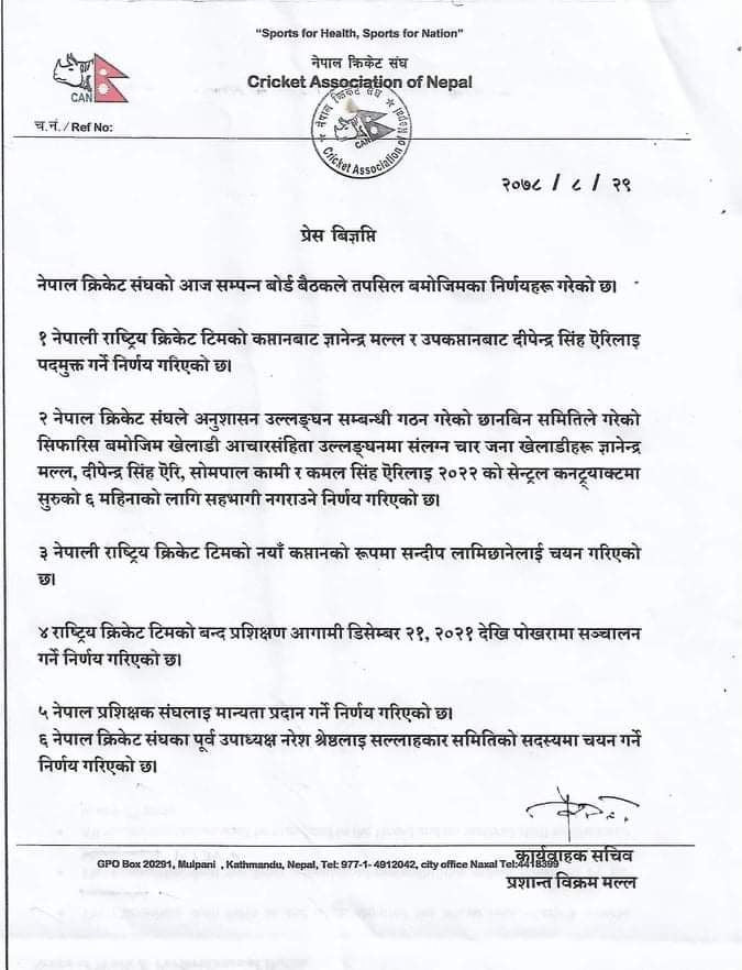 क्यानले जारी गरेको विज्ञप्तिमा कप्तान मल्ल र ऐरीसहित सोमपाल कामी र कमल सिंह ऐरीलाई सन् २०२२ को ‘सेन्ट्रल कन्ट्रयाक्ट’ मा सुरुको ६ महिलाको लागि सहभागि नगराउने निर्णय पनि गरेको छ ।