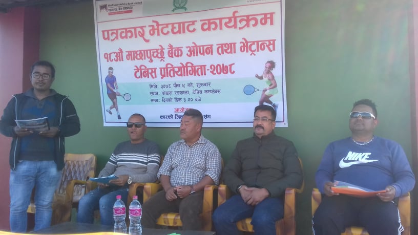 पोखरामा १८ औ माछापुच्छे« ओपन÷भेट्रान्स टेनिस प्रतियोगिता आयोजना हुने भएको छ । कास्की जिल्ला टेनिस संघको आयोजमा यहि पुस ११ देखि १५ गतेसम्म पोखरा रंगशालाको टेनिस कम्प्लेक्समा प्रतियोगिता आयोजना गर्न लागेको संघका अध्यक्ष लोकबहादुर गुरुङले जानकारी दिनुभयो । प्रतियोगितामा मेन्स सिंगल्स,डबल, उमेन्स सिंगल्स, डबल तथा ३५, ४५ र ५५ वर्षमाथि मेन्स सिंगल्स डबल्स र ६५ वर्षमाथि मेन्स सिंगल्स गरी ११ इभेन्टमा प्रतिस्प्र्धा हुने प्रतियोगिता संयोजक तथा संघका उपाध्यक्ष नविन चालिसेले जानकारी दिनुभयो ।