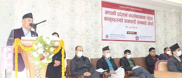 पोखरा ।गण्डकी प्रदेश सरकारका कानून, संचार तथा प्रदेश सभा मामिला मन्त्री विन्दु कुमार थापाले प्रदेश सरकार कानून निर्माण गर्न तर्फ मात्रै नभई कार्यान्वयनमा समेत केन्द्रीत रहेको बताउनुभएको छ । मूख्य न्यायाधिवक्ताको कार्यालय र गण्डकी प्रदेश प्रशिक्षण प्रतिष्ठानको संयुक्त आयोजनामा बुधबार भएको गण्डकी प्रदेशमा कार्यान्वयनमा रहेका कानूनहरुको जानकारी सम्बन्धी गोष्ठीलाई सम्बोधन गर्दै उहाँले यस्तो बताउनुभएको हो ।