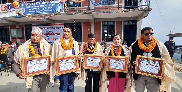 पोखरा, पुस २२ गते । कास्कीको रूपा गाउँपालिका–२, थुम्कीस्थित शिवालय माध्यमिक विद्यालयको ६१ औँ वार्षिकोत्सव सम्पन्न भएको छ ।सो अवसरमा विद्यालयको विकासका लागि विभिन्न ढङ्गले सहयोग गर्ने ५ जनालाई शिवालय वर्ष सम्मान २०७८ प्रदान गरिएको थियो । सम्मानित हुनेमा विद्यालयकी शिक्षिका रस्मिला खनाल, पूर्व विद्यार्थी तथा पृथ्वीनारायण क्याम्पसका उपप्राध्यापक मनबहादुर भुजेल, पूर्व विद्यार्थी तथा लेखनाथ उद्योग वाणिज्य सङ्घका प्रथम उपाध्यक्ष राजेन्द्र ओझा, विद्यालय व्यवस्थापन समितिका पूर्व सदस्य दुर्गाबहादुर विक र पूर्व प्रधानाध्यापक रोशनलाल गुरुङ रहेका थिए ।