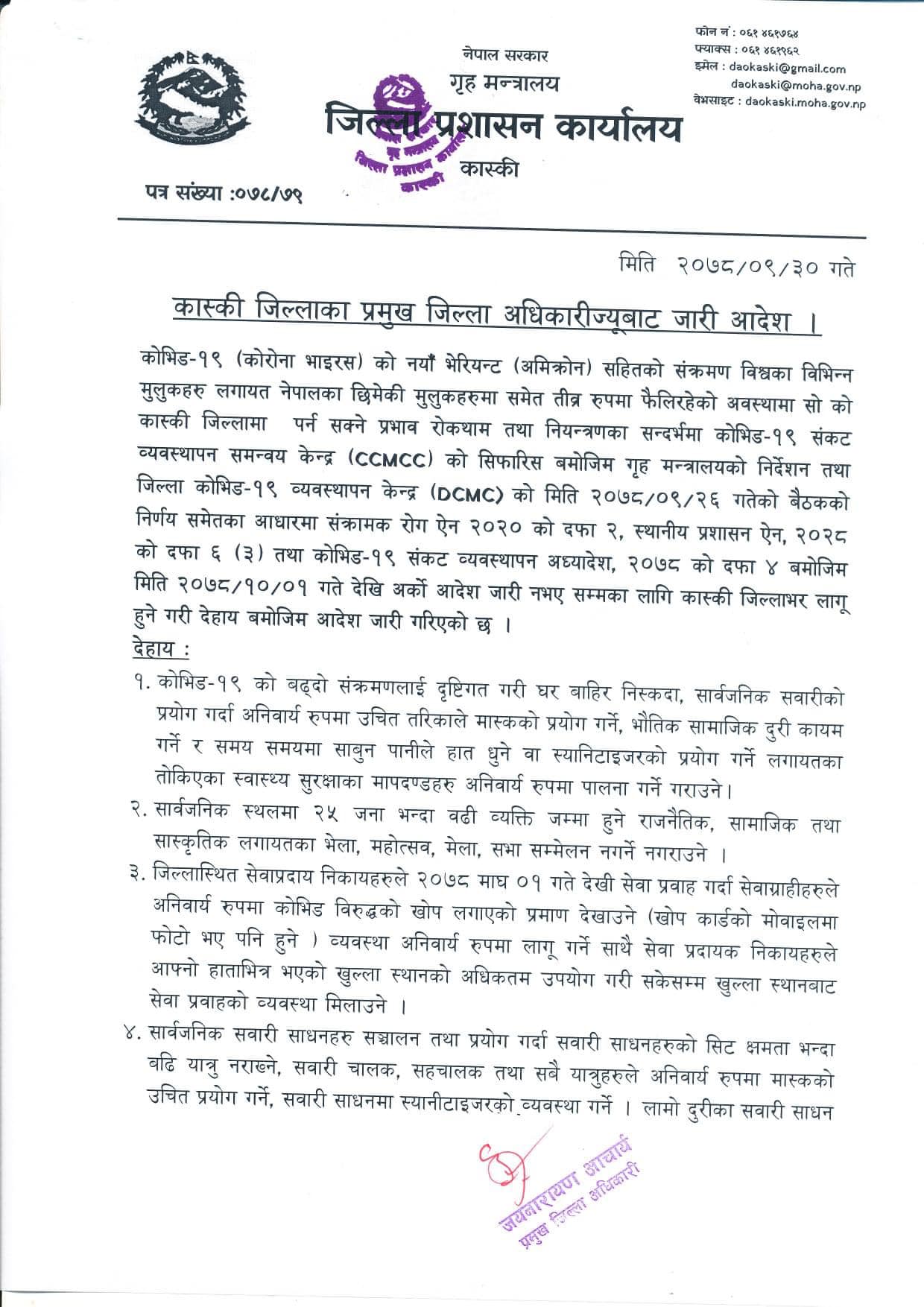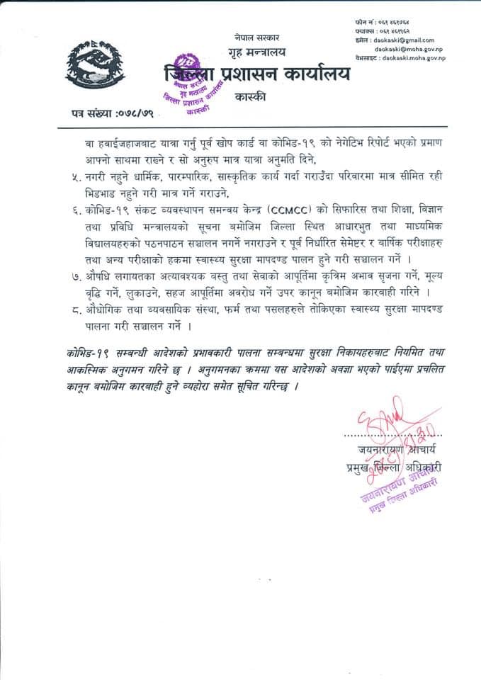 प्रशासनले जिल्लास्थित सेवा प्रदायक निकायहरुमा सेवा प्रवाह गर्दा सेवाग्राहीहरुले अनिवार्य कोभिडबिरुद्धको खोप लगाएको प्रमाण देखाउनुपर्ने भनेको छ । साथै सेवा प्रदायकहरुले खुल्ला स्थानमा अनिवार्य सामाजिक दुरी कायम गरेर सेवा दिने ब्यबस्था मिलाउनपनि भनेको छ ।प्रशासनले कोभिडको बढ्दो संक्रमणलाई दृष्टिगत गरि घर बाहिर निस्कदा, सार्वजनिक सवारी प्रयोग गर्दा अनिवार्य रुपमा उचित तरिकाले मास्कको प्रयोग गर्ने, भौतिक सामाजिक दुरी कायम गर्नुपर्ने र समय समयमा साबुनपानीले हात धुने वा स्यानिटाइजरको प्रयोगसहितका तोकिएका स्वास्थ्य मापदण्ड पालना गर्न÷गराउन आदेश जारी गरेको छ ।