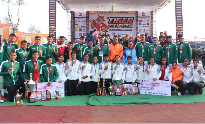 पोखरा, माघ १ गते ।दोस्रो संस्करणको ‘टाइगर कप आमन्त्रित खुला महिला तथा पुरुष भलिबल’ प्रतियोगितामा पुरुषतर्फ त्रिभुवन आर्मी क्लब र महिलातर्फ सशस्त्र प्रहरीो एपीएफ क्लबले उपाधि जितेका छन् ।टाइगर ग्रुप अफ पोखराका आयोजनामा यही पुस २६ गतेदेखी पोखरा रंगशालास्थित भलिबल प्रशिक्षण केन्द्रमा सञ्चालन भएको प्रतियोगिताको शनिबार सम्पन्न फाइनल खेलमा पुरुषतर्फ आर्मीले टिप टप हेल्प नेपाल स्पोर्ट्स क्लबमाथि ३–१ को सेटमा जित निकाल्दै च्याम्पियन बन्न सफल भएको हो ।