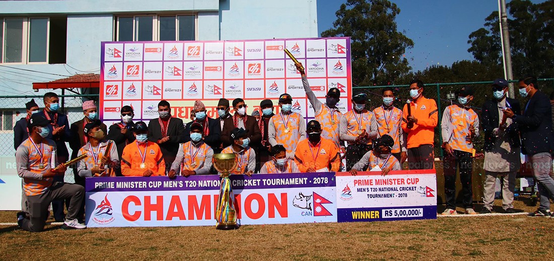 काठमाडौँ, माघ ५ गते । प्रधानमन्त्री (पीएम) कप टी–२० क्रिकेट प्रतियोगिताको उपाधि एपिएफ क्लबले जितेको छ ।