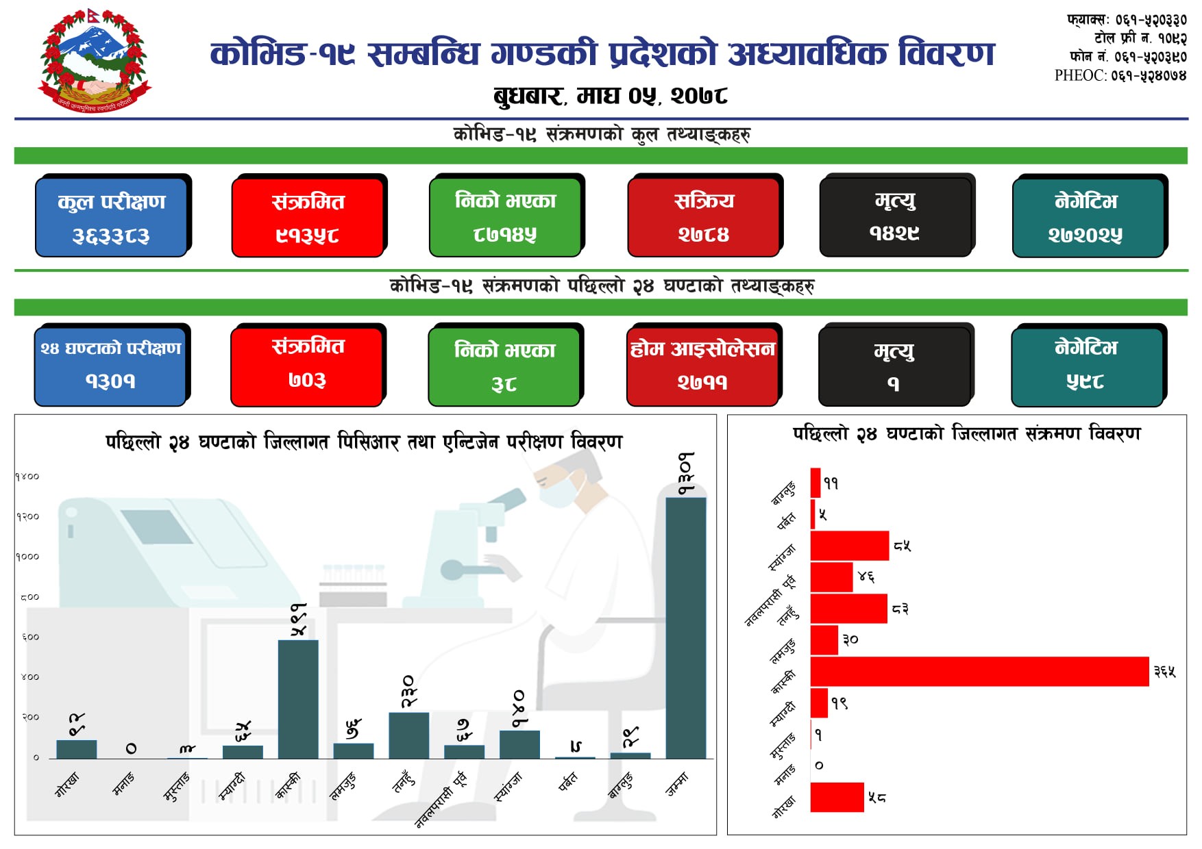 पोखरा, माघ ५ गते ।गण्डकी प्रदेशमा कोरोना भाइस संक्रमण ह्वत्तै बढेको छ। पछिल्लो २४ घण्टामा गण्डकीमा ७०३ जनामा कोरोना संक्रमण पुष्टि भएको छ ।