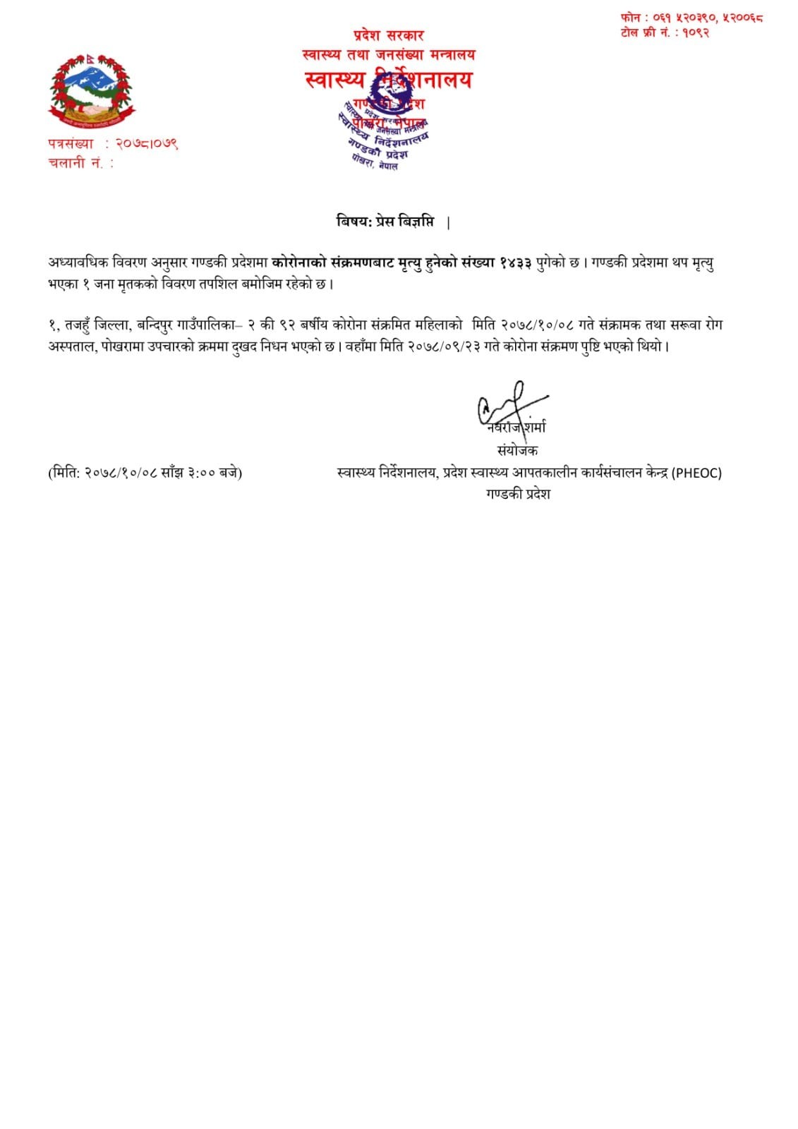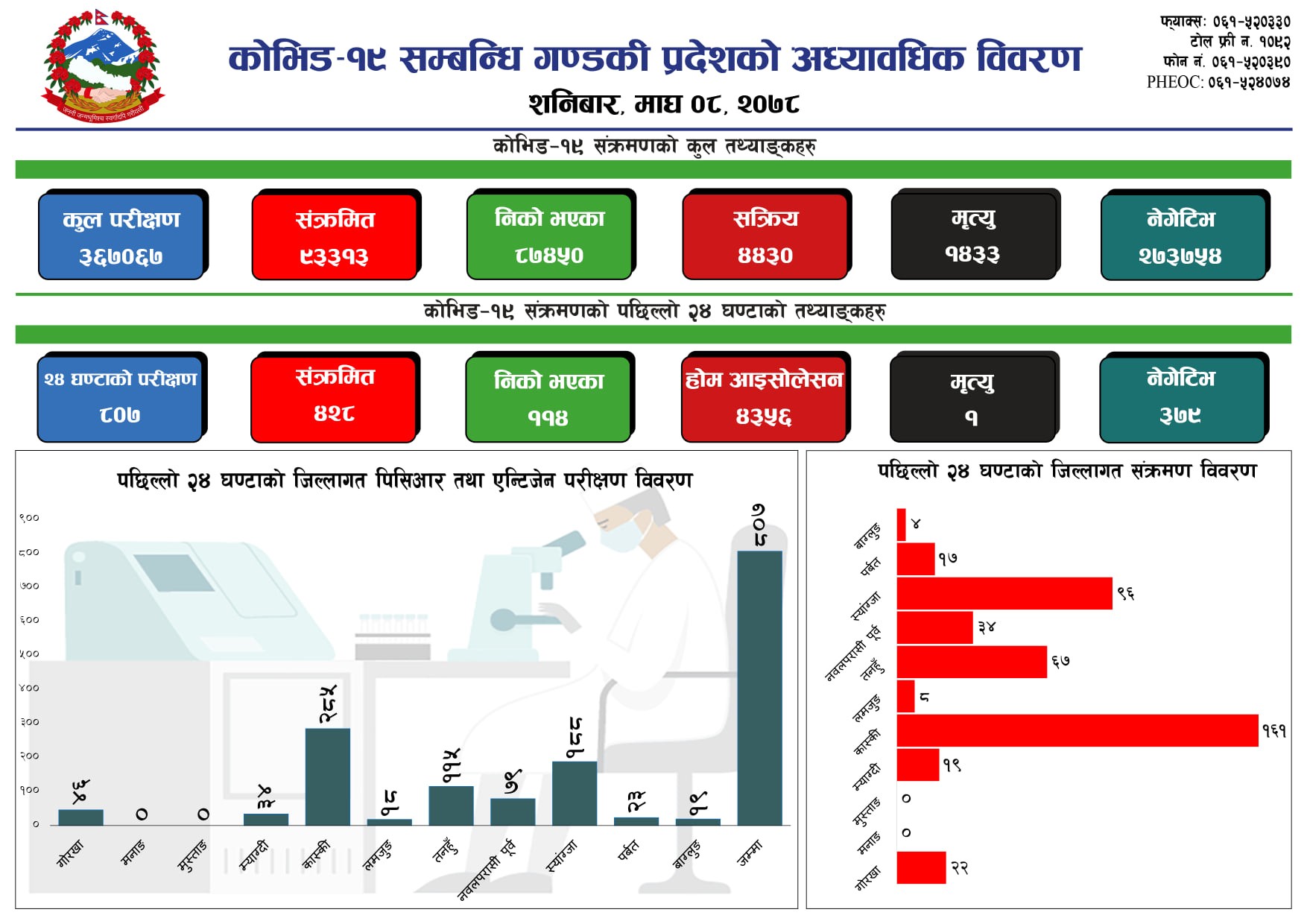 गण्डकीमा शनिबार ११४ जना कोरोना संक्रमण मुक्त भएका छन् । गण्डकीमा ४३५६ जना होमआइसोलेसनमा रहेका छन । यस्तै गण्डकीमा शनिबार कोरोना संक्रमणबाट एक जनाको मृत्यु भएकोछ । मृत्यु हुनेमा तनहुँ जिल्ला बन्दिपुर गाँउपालिका २ की ९२ वषीय कोरोना संक्रमित महिला रहेको निर्देशनालयले जनाएको छ । संक्रमित महिलाको पोखराको संक्रामक तथा सरुवा रोग अस्पतालमा उपचारका क्रममा निधन भएको हो । महिलालाई पुस २३ गते संक्रमण पुष्टि भएको निर्देशनालयले जनाएको छ ।