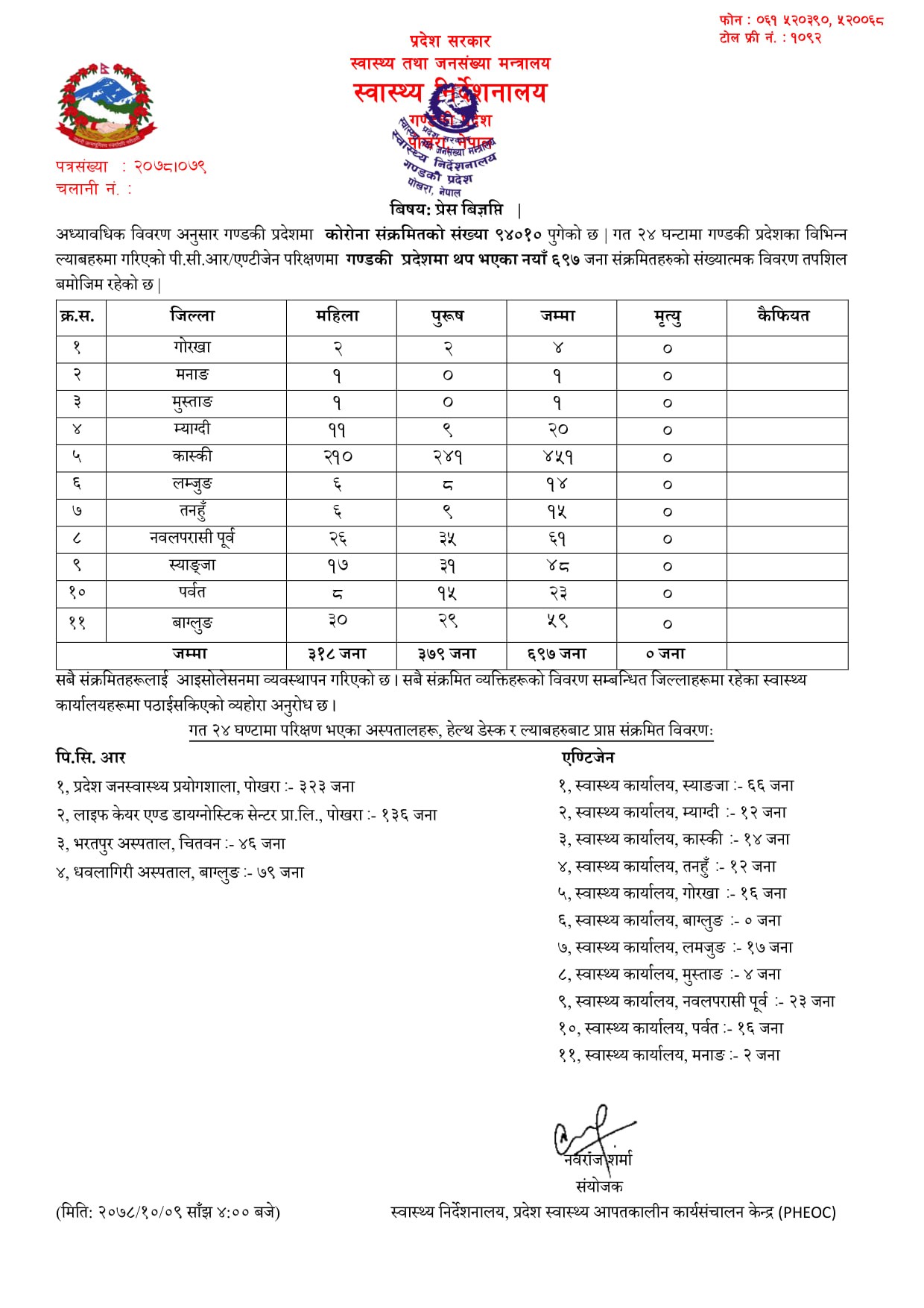 आइतबार मात्रै कास्कीमा ४५१ जना ंक्रमित थपिएका छन् । त्यस्तै स्यांजामा ४८ जना, तनहुँमा १५ जना, नवलपरासी पूर्वमा ६१ जना, पर्वतमा २३ जना, गोरखामा ४ जना र बागलुंमा ५९ जना, मनांगमा १ र मुस्तांगमा १ जनामा मा कोरोना संक्रमण पुष्टि भएको छ । गण्डकीमा आइतबार १६५ जना कोरोना संक्रमण मुक्त भएका छन् । गण्डकीमा ४८७४ जना होमआइसोलेसनमा रहेका छन । यस्तै गण्डकीमा शनिबार कोरोना संक्रमणबाट एक जनाको मृत्यु भएकोछ ।