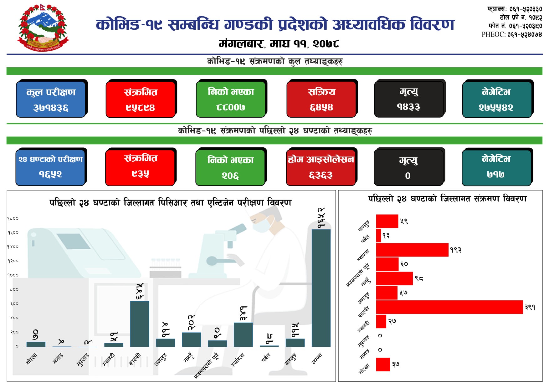 त्यस्तै स्ंयाजामा १९३,तनहुँ ९८,नवलपरासी पूर्व ६०,लमजुंग ५७,बाग्लुंग ५९,गोरखा ३७,म्याग्दी २७ र पर्वतका १३ जना संक्रमित थपिएका छन् ।गण्डकीमा मंगलबारसम्म संक्रमितको संख्या ९५८९४ रहेको छ भने ८८००७ निको भएका छन् । गण्डकीमा हाल संक्रिय संक्रमितको संख्या ६४५४ रहेको छ ।हालसम्म कोरोनाका कारण १४३३ जनाको मृत्यु भएको छ ।