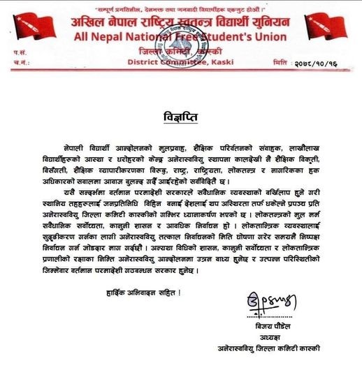अनेरास्ववियुले जिल्ला कमिटि कास्कीले आइतबार साँझ विज्ञप्ति जारी गदै वर्तमान शेरबहादुर देउवा नेतृत्वको परमादेशी सरकारले संवैधानिक व्यवस्थाको बर्खिलाप हने गरी स्थानिय तहरुलाई जनप्रतिनिधि विहिन बताउदै अस्थिरता तर्फ धकेल्ने प्रपञ्च गरेको भन्दै गम्भिर ध्यानाकर्षण भएको जनाएको छ । लोकतन्त्रको मुल मर्म संवैधानिक सर्वोच्चता, कानूनी शासन र आवधिक निवाृचन हो अनेरास्ववियु कास्कीका अध्यक्ष विजय पौडेलले जारी गरेको विज्ञप्तिमा  भनिएको छ ।