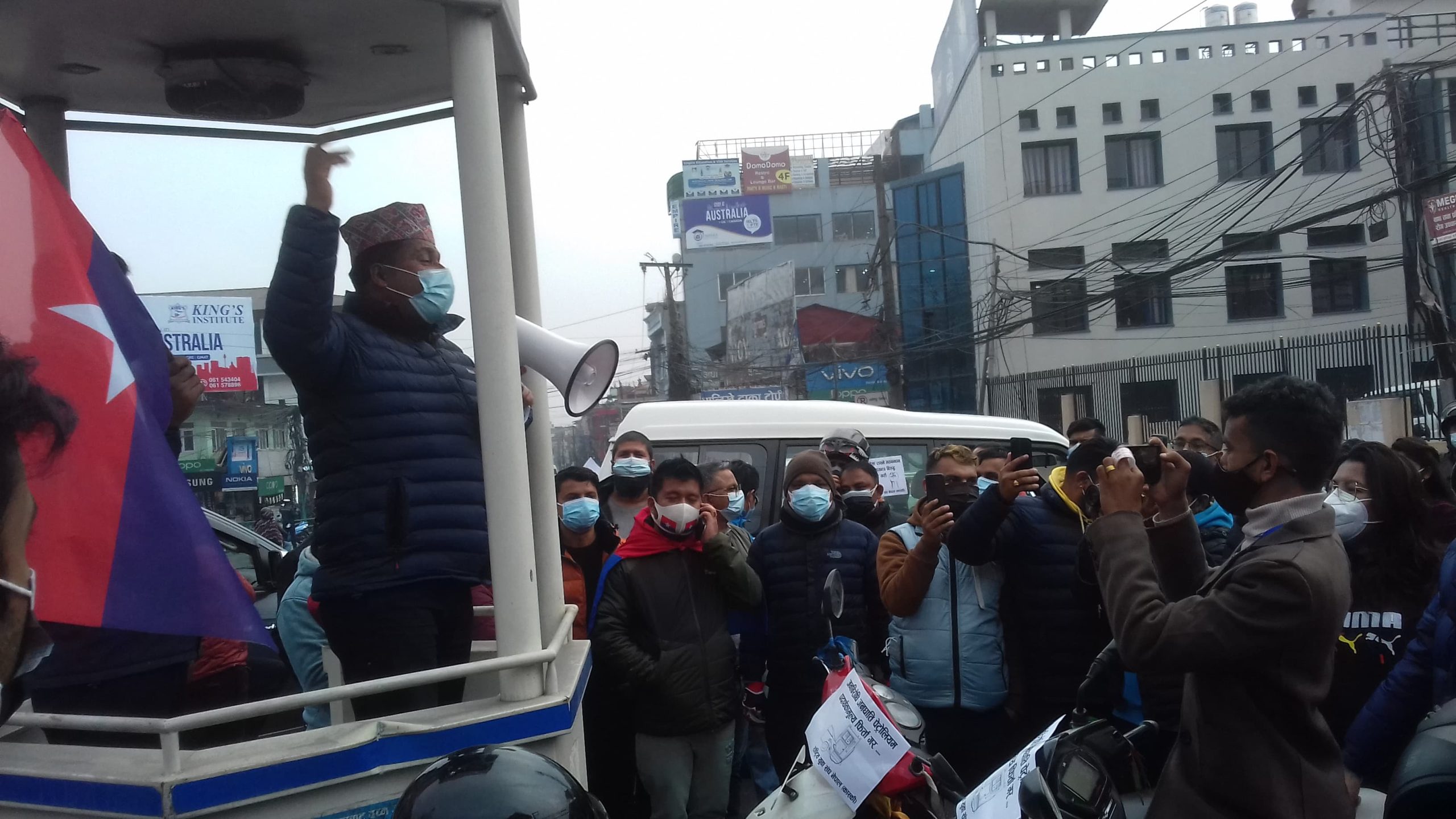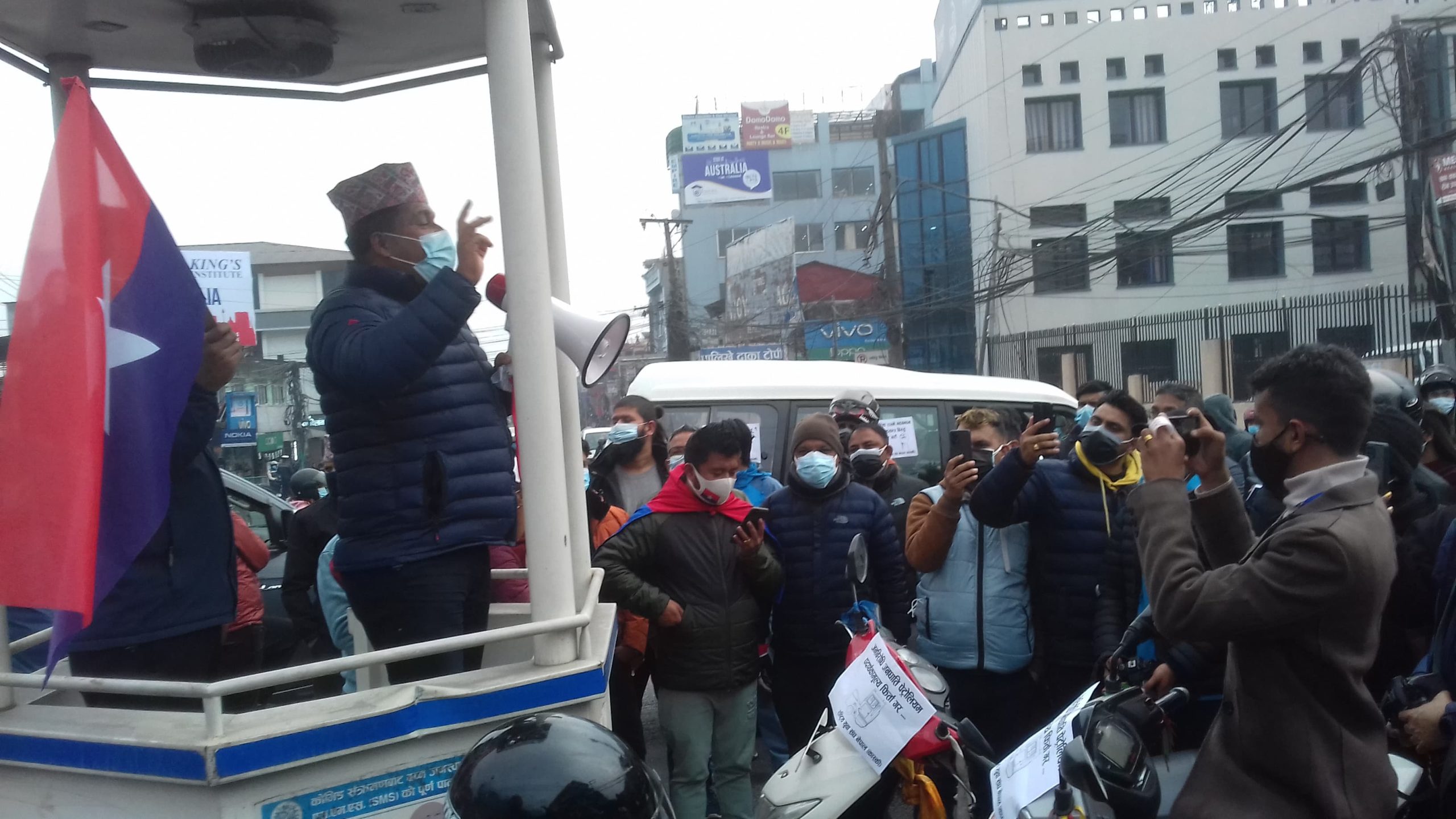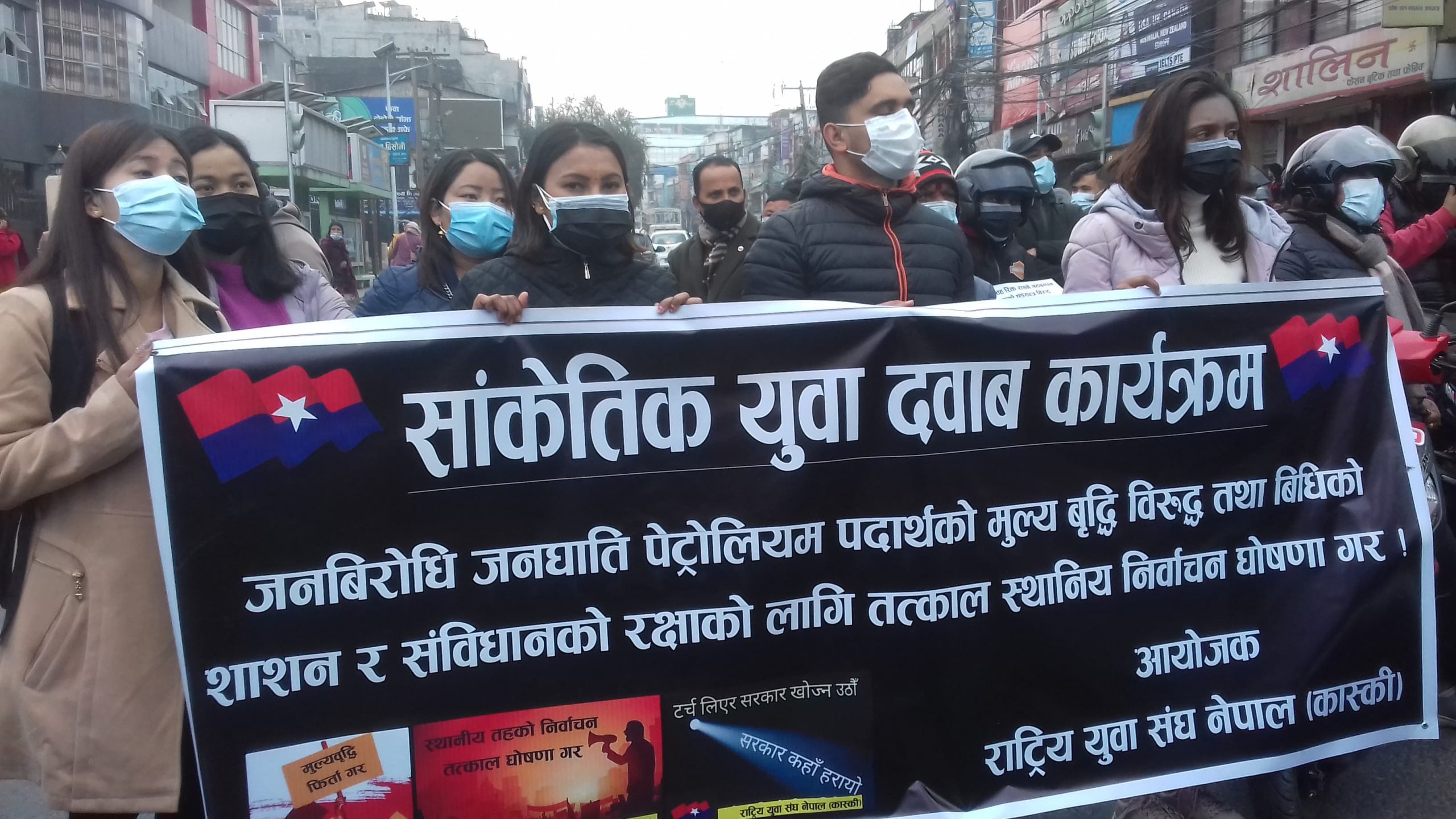 “जनविरोधि जनघाती पेट्रोलियम पदार्थको मुल्यबृद्धि विरुद्ध तथा विधिको शासन र संविधानको रक्षाका लागि तत्काल स्थानिय निर्वाचन घोषणा गर” लेखिएको ब्यानर सहित युवा संघका नेता कार्यकता प्रर्दशनमा उत्रेका थिए ।