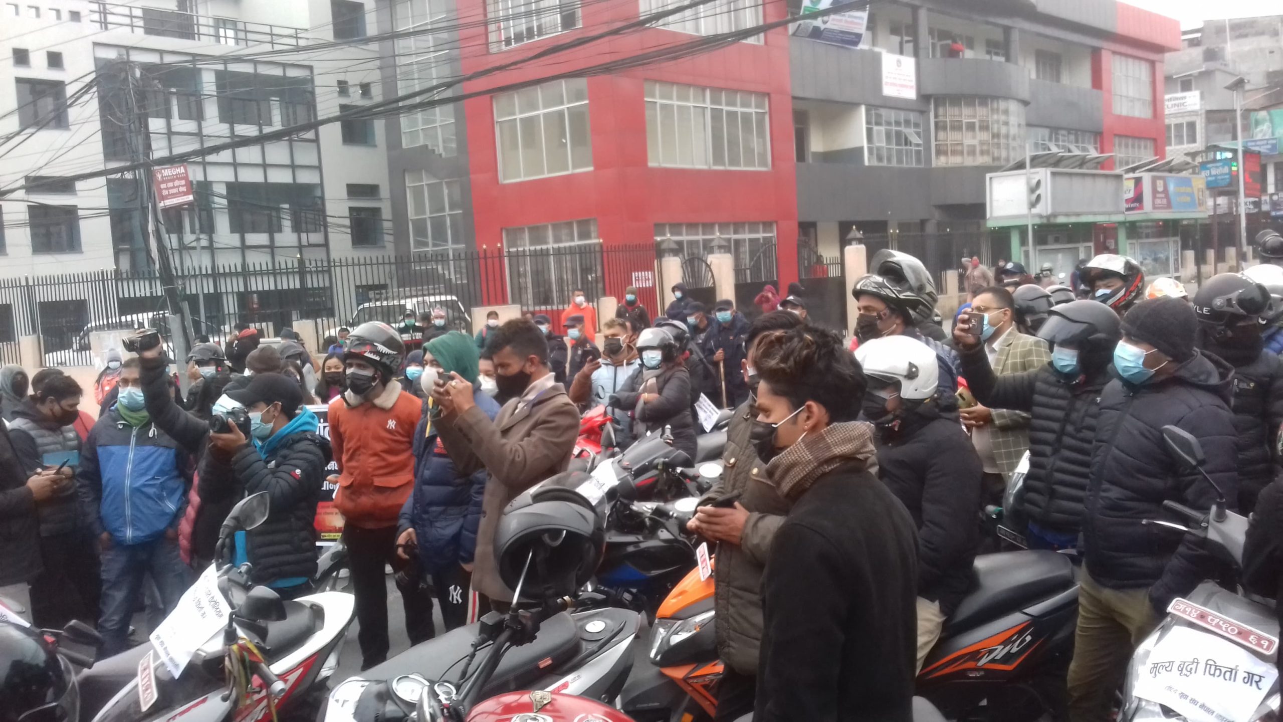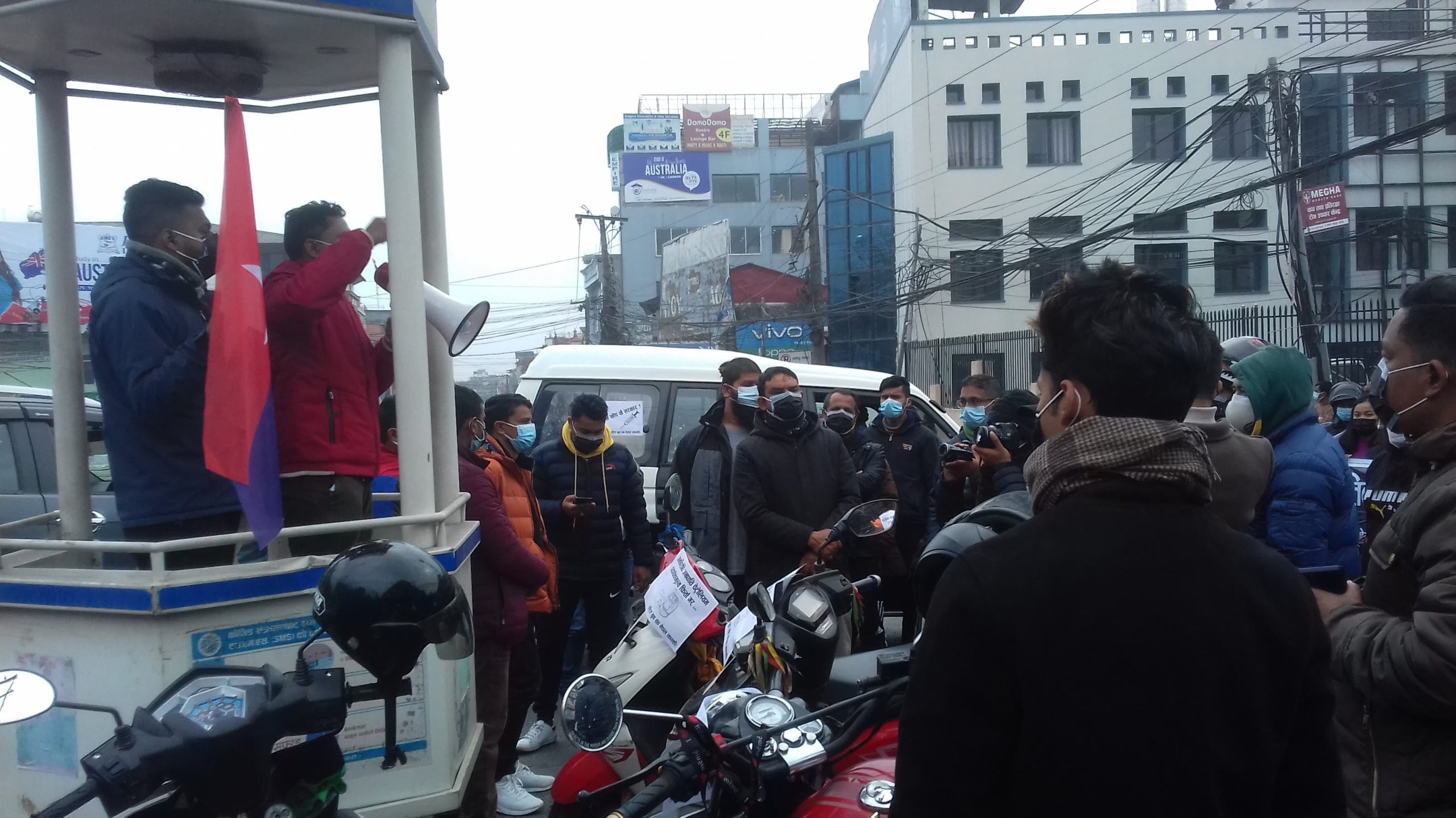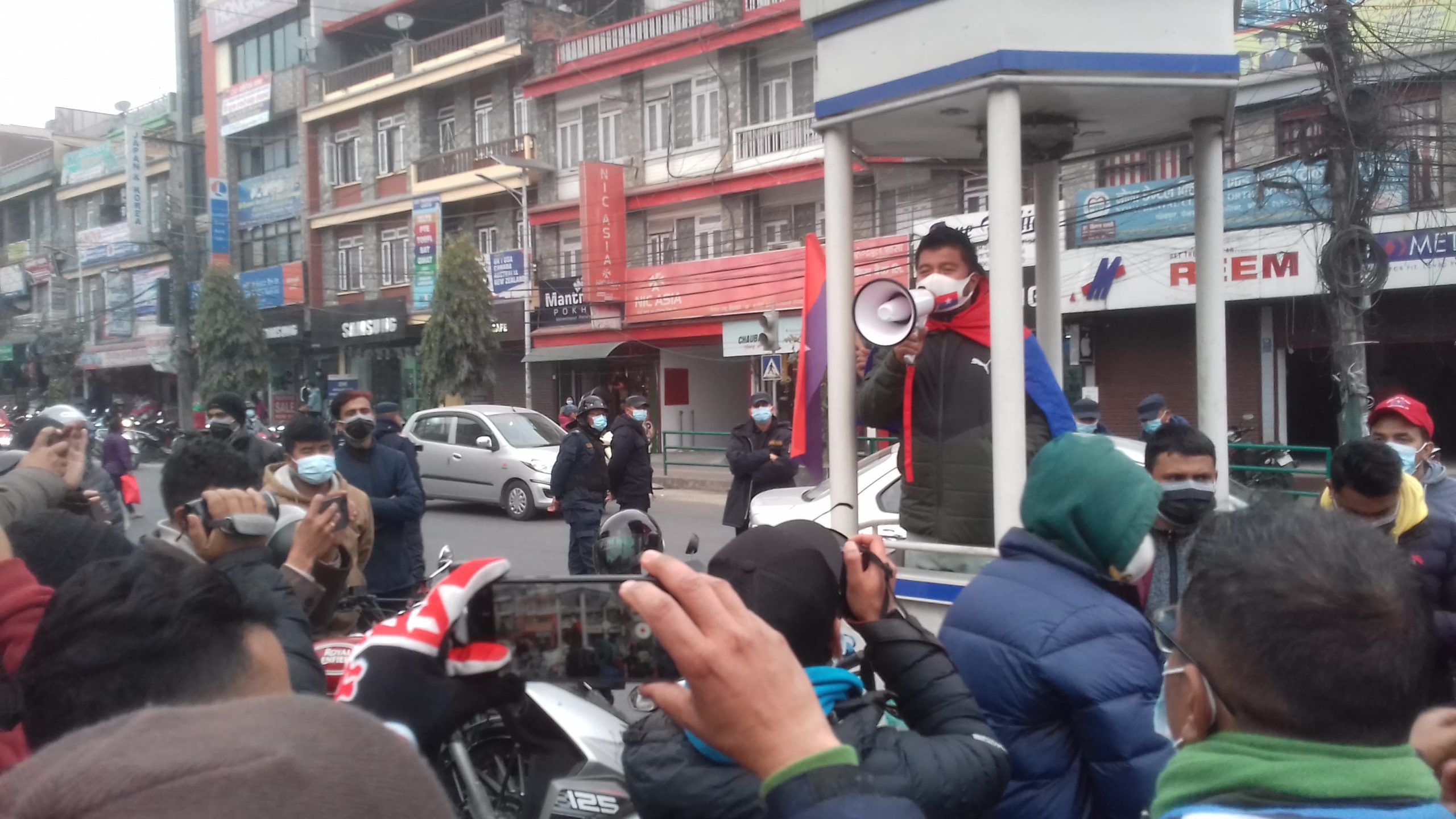 “जनविरोधि जनघाती पेट्रोलियम पदार्थको मुल्यबृद्धि विरुद्ध तथा विधिको शासन र संविधानको रक्षाका लागि तत्काल स्थानिय निर्वाचन घोषणा गर” लेखिएको ब्यानर सहित युवा संघका नेता कार्यकता प्रर्दशनमा उत्रेका थिए ।