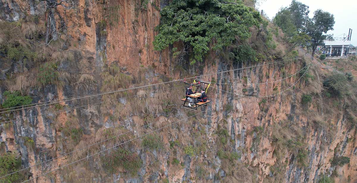 त्यहाँ बसिरहेका ग्राहकले यात्रा सुरु गर्ने बेला ‘अर्डर’ गरेका खानेकुरा खाँदै खुला आकाशमा यात्रा गर्न पाउँछन् । “बन्जीसहितका अन्य साहसिक खेलका लागि पर्वतको द क्लिफ पर्यायवाची भइसकेको छ, हामी सकेसम्मका फरक तर एडभेन्चर खालका खेल तथा पूर्वाधारको निर्माणमा जुटिरहेका छौँ, स्काई क्याफे पनि यही अवधारणामा तयार भएको हो”, कार्कीले भन्नुभयो, “तारमा झुन्डिएर हिँडिरहेको क्याफेमा बसेर खाजा खानुको मजा बेग्लै छ ।