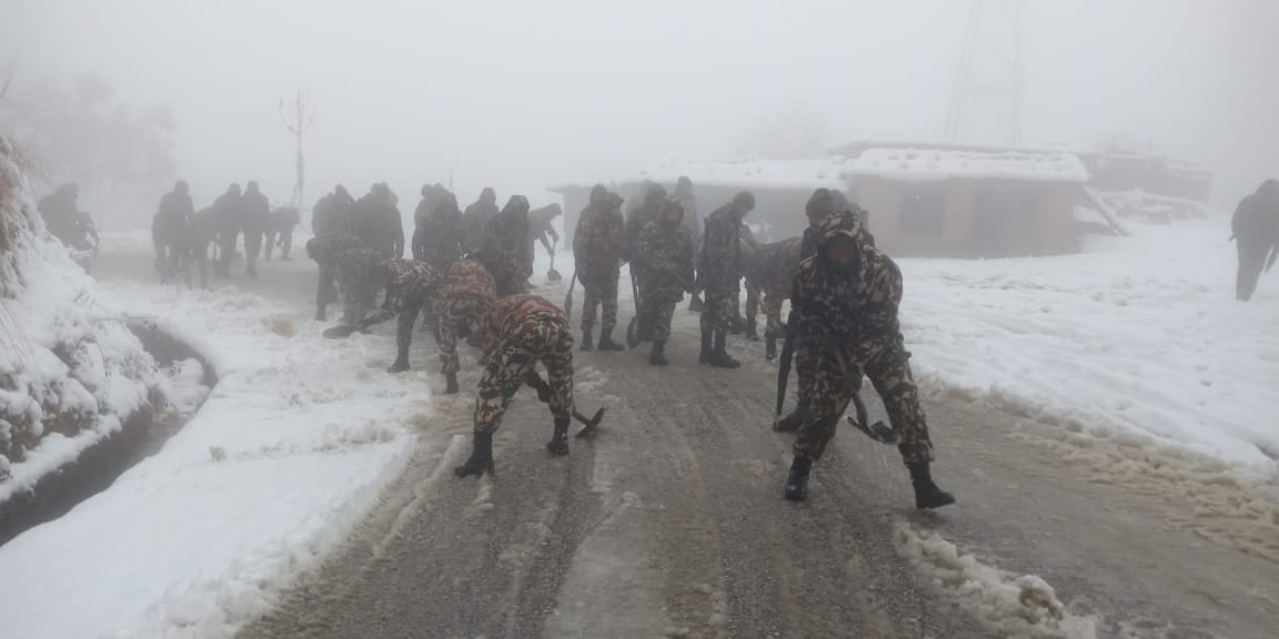 बागलुङको निसीखोला गाउँपालिका र पूर्वी रुकुमको सिमाना पातिहाल्नेमा अत्यधिक हिमपात भएपछि यातायात ठप्प भएको हो । निसीखोलाको सीप क्षेत्रदेखि माथिल्लो भेगमा दुई फिटभन्दा बढी हिउँ जमेको हुँदा सडक अवरुद्ध भएको स्थानीयवासी अबिन घर्ती मगरले जानकारी दिनुभयो । उहाँले सिमानाभन्दा तल्लो क्षेत्रमै दुई फिटभन्दा बढी हिउँ जमेको भन्दै सिमाना अझ बढी हिउँ भएको बताउनुभयो ।