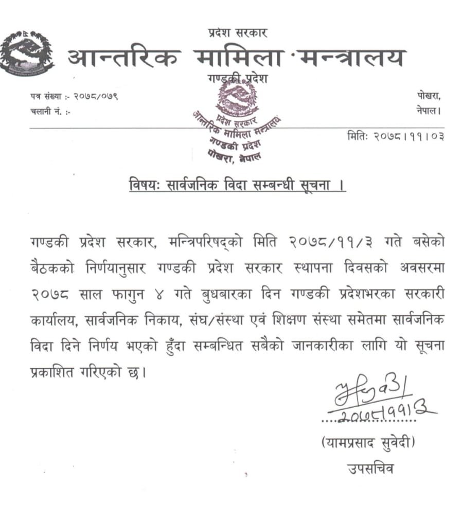 पोखरा, फागुन ३ गते । बुधबार गण्डकी प्रदेशमा सार्वजनीक विदा घोषणा गरिएको छ । प्रदेश स्थापना दिवसका अवसरमा भोली बुधबार गण्डकी प्रदेश सरकारले सार्वजनिक विदा दिने निर्णय गरेको हो । मन्त्रिपरिषदको मंगलबार बसेको बैठकले उक्त निर्णय गरेको हो । २०७४ साल फागुन ४ गते गण्डकी प्रदेश सरकार गठन भएको हो । पृथ्वीसुब्बा गुरुङ नेतृत्वमा गण्डकीमा सरकार गठन भएको थियो । प्रदेश सरकार गठन भएको दिनलाई नै सरकारले प्रदेश दिवस मनाउँदै आएको छ ।