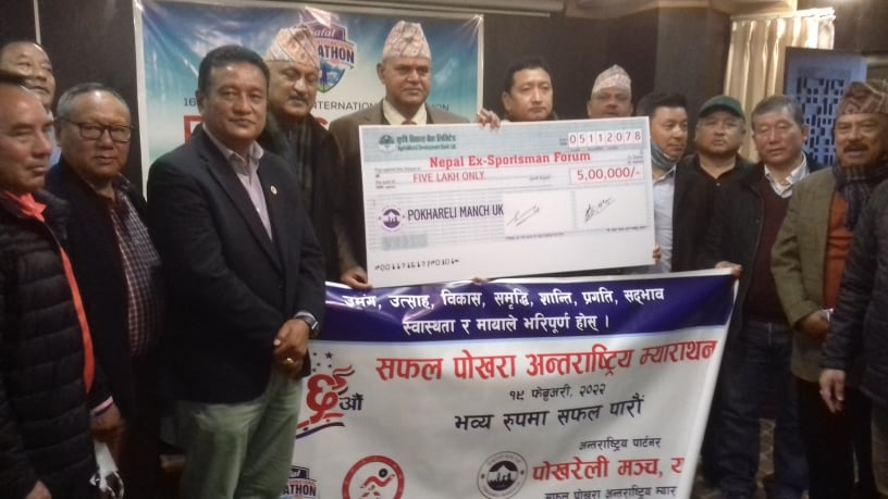 पोखरा सफल म्याराथनलाई पोखरेली मञ्च यूकेले आर्थिक सहयोग प्रदान गरेको छ । म्याराथनबारे जानकारी दिन आयोजित पत्रकार सम्मेलनमा पोखरेली मञ्च यूकेका अध्यक्ष मनप्रसाद गुरुंगले भूतपूर्व खेलाडी मञ्चका अध्यक्ष हरिप्रसाद पराजुलीलाई ५ लाख रुपैयाँ हस्तान्तरण गर्नुभयो । यूकेमा रहेका नेपालीहरुबाट पोखरा म्याराथनलाई सहयोगका लागि रकम संकलन गरिएको हो ।