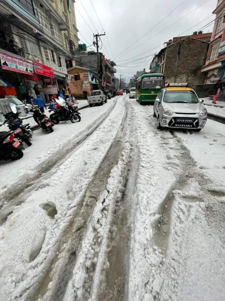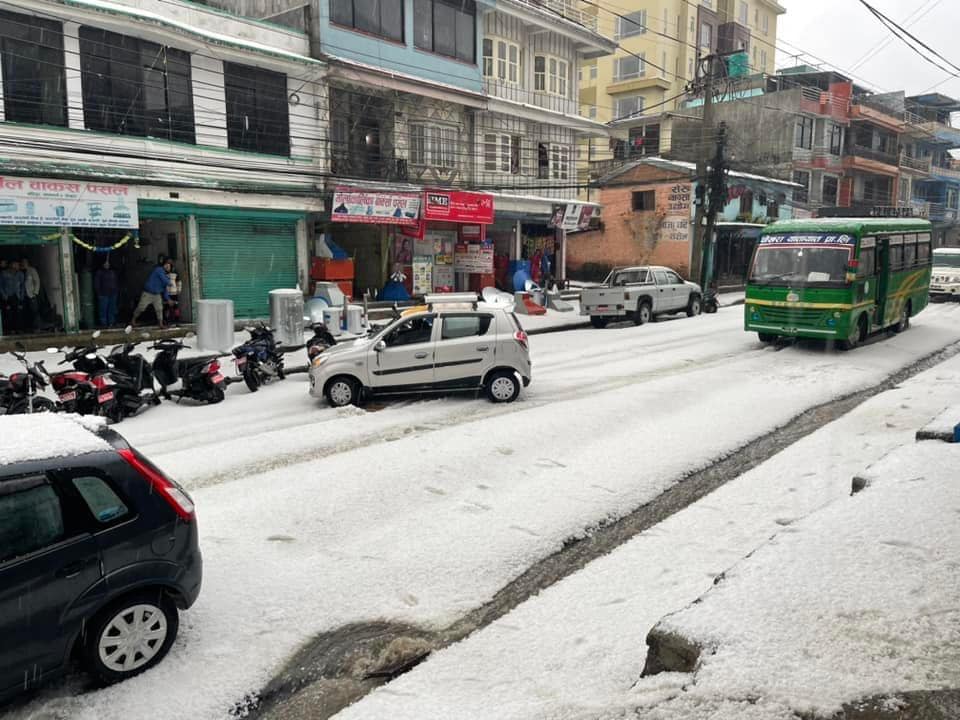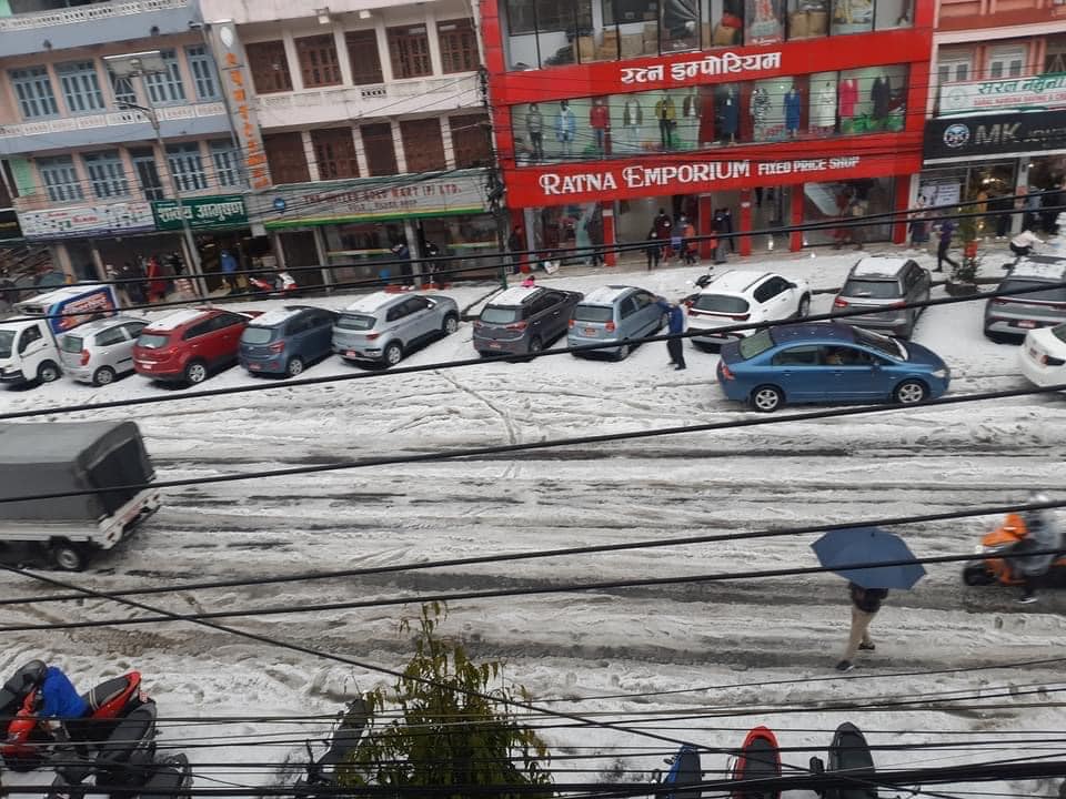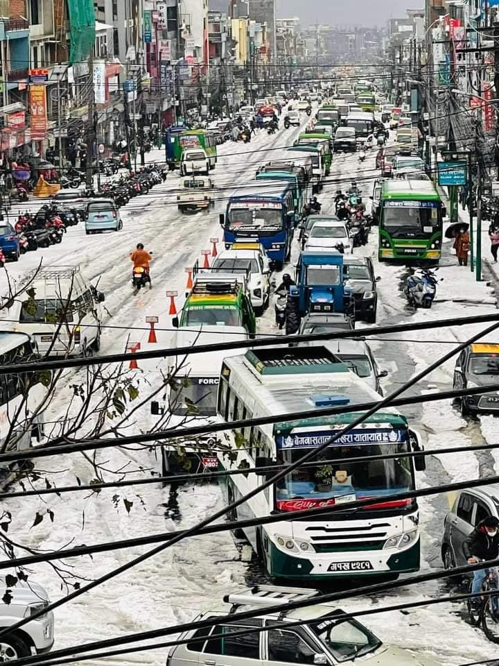 आज दिउसो एक्कासी भिषण असिना पानी परेको हो । सडकमा सवारीनै चल्न सक्ने गरी पोखरामा अहिलेसम्मकै बाक्लो असिना परेको हो । झण्डै एक घण्टा परेको असिना पानीले सडकमा सवारी चलाउनै मुश्किल परेको थियो ।