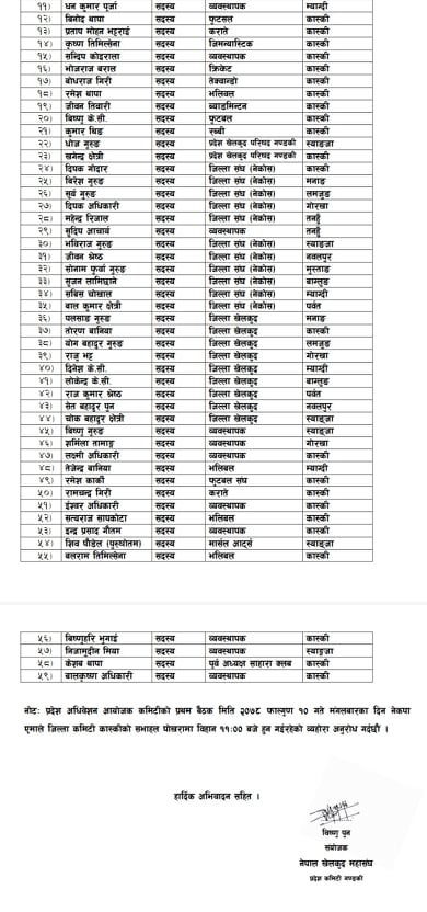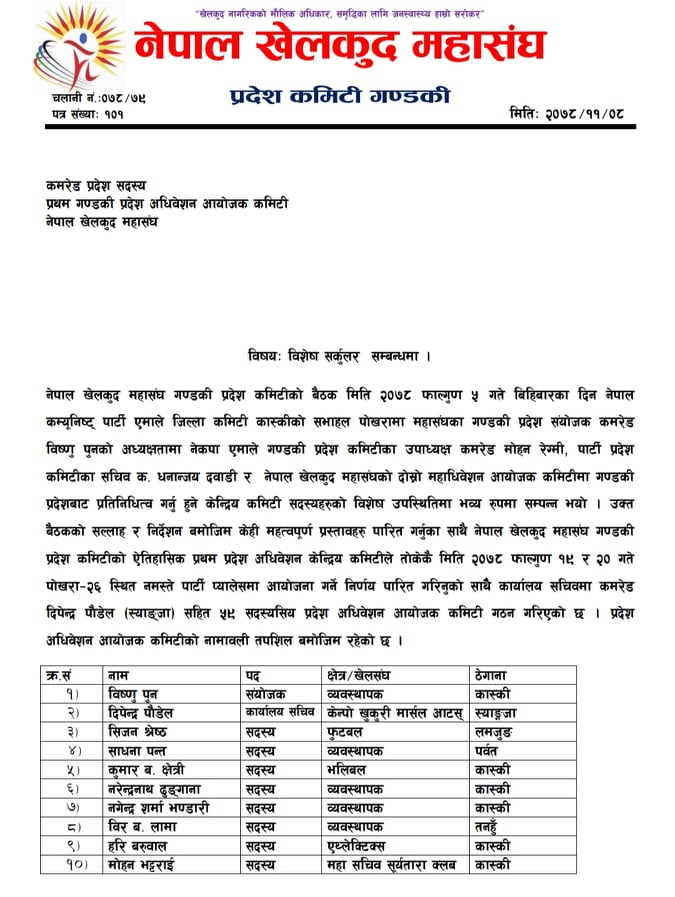 नेकपा एमाले गण्डकी प्रदेश कमिटी उपाध्यक्ष मोहन रेग्मी,पार्टी प्रदेश कमिटी सचिव धनन्जय दवाडी र खेलकुद महासंघमा गण्डकी प्रदेशबाट प्रतिनिधित्व गर्ने केन्द्रीय सदस्यहरुको विशेष उपस्थितिमा पोखरामा हालैसम्पन्न बैठकले प्रथम अधिवेशन सम्पन्न गर्न आयोजक कमिटी चयन गरेको छ ।