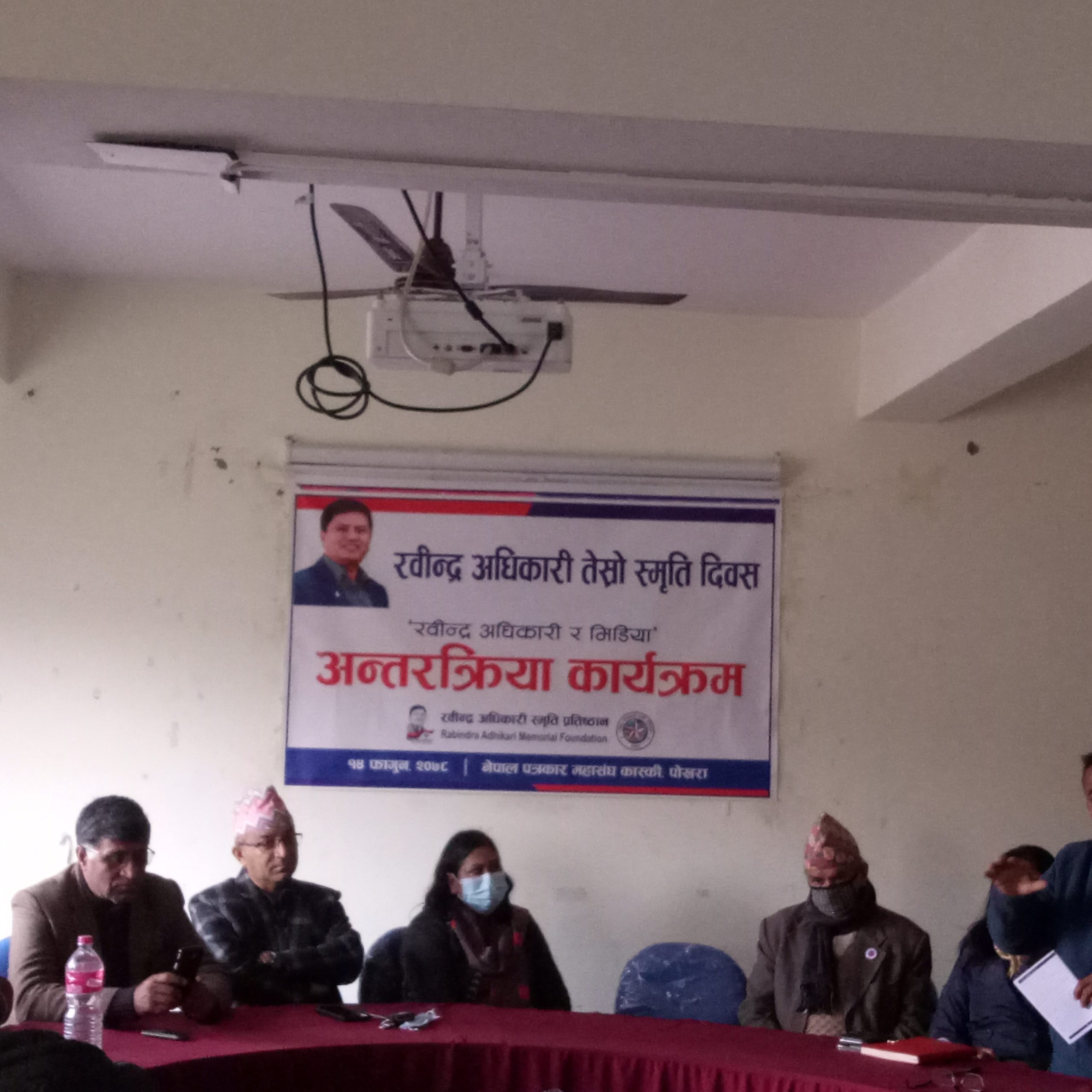 पोखरा ,फागुन /नेकपा एमालेका नेता तथा तत्कालीन संस्कृति पर्यटन तथा नागरिक उड्डयन मन्त्री स्वर्गीय रबिन्द्र प्रसाद अधिकारीको स्मृतिमा पत्रकारिता पुरस्कार स्थापना हुने भएको छ। अधिकारीको नाममा स्थापना भएको रबिन्द्र अधिकारी स्मृति प्रतिष्ठानले सो पुरस्कार स्थापना गर्न लागेको हो । स्व. अधिकारीको तेस्रो स्मृति दिबसका सन्दर्भमा सनिबार पोखरा मा आयोजित रबिन्द्र अधिकारी र मिडिया बिषयक अन्तरक्रिया कार्यक्रममा सो कुराको जानकारी दिइएको हो।