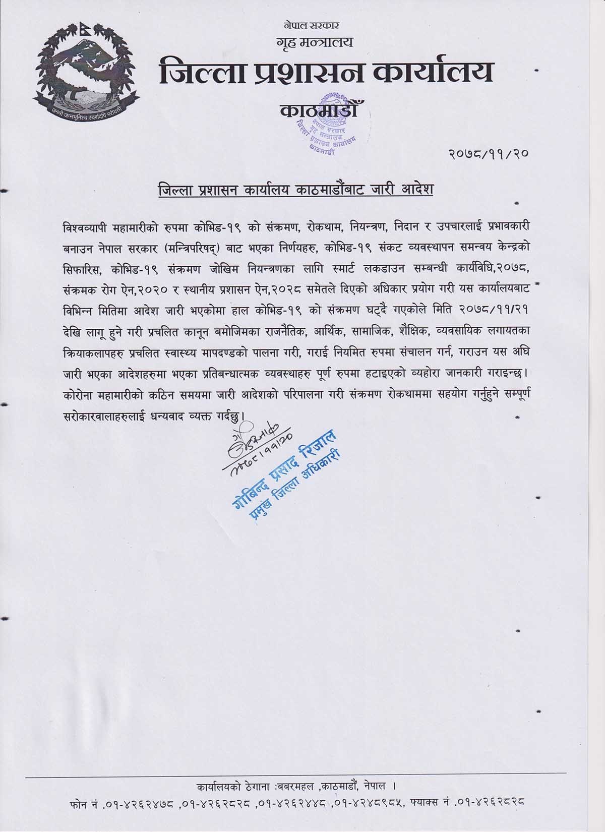 काठमाडौंका प्रमुख जिल्ला अधिकारी गोविन्दप्रसाद रिजालले आदेश जारी गर्दै यसअघि लागू भएका सम्पूर्ण प्रतिबन्धात्मक व्यवस्था पूर्ण रुपमा हटाइएको जानकारी दिनुभएको हो। जिल्ला प्रशासन कार्यालयले फागुन २१ गतेदेखि लागू हुने गरी उक्त आदेश जारी गरेको हो।