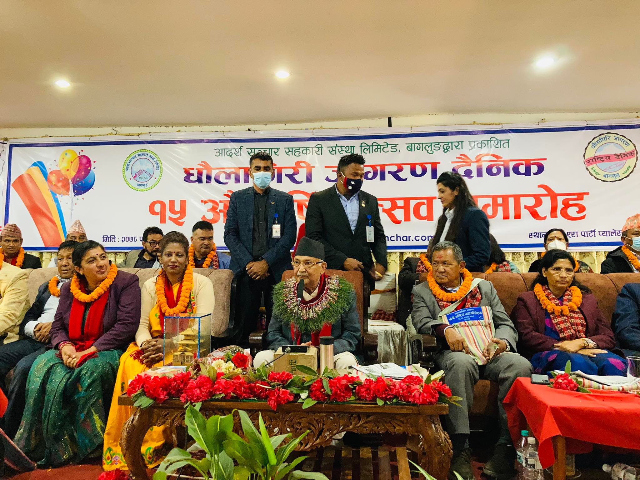 पोखरा, फागुन २३ गते । आदर्श सञ्चार सहकारी संस्था लिमिटेड बागलुङद्वारा प्रकाशित धौलागिरी जागरण दैनिकले १५ औं वार्षिकोत्सव सोमबार पोखरामा मनाएको छ । वार्षिकोत्सव समारोहलाई सम्बोधनगर्दै पूर्व प्रधानमन्त्रीतथा नेकपा एमालेका अध्यक्ष केपी शर्मा ओलीले जनजागरणमा जागरण दैनिकको भूमिका महत्वपूर्ण रहेको बताउनुभयो ।