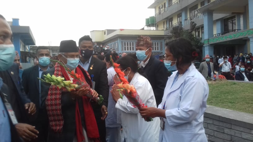यसैवीच अक्सिजन प्लान्टको एमाले अध्यक्ष एवं पूर्वप्रधानमन्त्री केपी शर्मा ओलीले सोमबार उद्घाटन गर्नुभयो । उहाँले प्लान्ट स्थापनाले अक्सिजनकै अभावमा ज्यान गुमाउनुपर्ने अवस्थाको अन्त्य भएको बताउनुभयो । अक्सिनकै अभावमा ज्यान गुमाउनुपर्ने भएकाले यो महत्वपूर्ण रहेको बताउदै भन्नुभयो,‘ अक्सिजनकोअभावमा अव मृत्यु हुदैन् । यो यहाँ मात्रैहैन अन्यत्र समेत लैजान सकिन्छ ।’ उहाँले आफनो प्रधानमन्त्री कालमा स्वास्थ्य नीति निरोगी नेपाल भन्ने नारा राखेर अगाडी बढेको बताउनुभयो । नागरिकलाई रोग लाग्नै नदिने नीति अनुसार स्वस्थ, स्वाच्छ र सन्तुलित खाना खान पाउने अवस्था भएमा रोग नलाग्ने उहाँको भनाई थियो । उहाँले स्वाथ्यलाई प्राथमिकतामा राखेर ३९६ वटा अस्पताल एकै दिन शिलान्यास गरिएको समेत बताउनुभयो । हरेक पालिकामा ५ देखि १५ बेडसम्मका अस्पताल स्थापना गर्नुपर्छ भन्ने मान्यता सहित शिलान्यास गरिएको बताउनुभयो ।