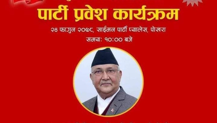 कार्यक्रममा पूर्व संविधान सभा सदस्य डिलबहादुर नेपाली, जनता समाजबादी पार्टीका नेता देवी सुवेदी, गायिका पार्वती जिसी लगाय, काँग्रेस र माओबादी परित्याग गरी सयौजना एमाले प्रवेश गर्दै छन् । विभिन्न पार्टी परित्याग गरेर आउनेहरुलाई एमाले अध्यक्ष एवं पूर्वप्रधानमन्त्री केपी शर्मा ओलीले पार्टी प्रवेश गराउने कार्यक्रम रहेको छ । पोखराको सृजनाचोकस्थित साइमन पार्टी प्यालेसमा आयोजना हुन कार्यक्रममा ओली सहभागी हुने एमालेले जनाएको छ । यस अघि फागुन १३ गते पनि पार्टी प्रवेश कार्यक्रममा ११ सय बढि एमाले प्रवेश गरेका थिए । जनता समाज पार्टीका चार केन्द्रीय सदस्य सहित ११ सय बढिले अन्य पार्टी परित्याग गदै एमलो प्रवेश गरेका थिए ।