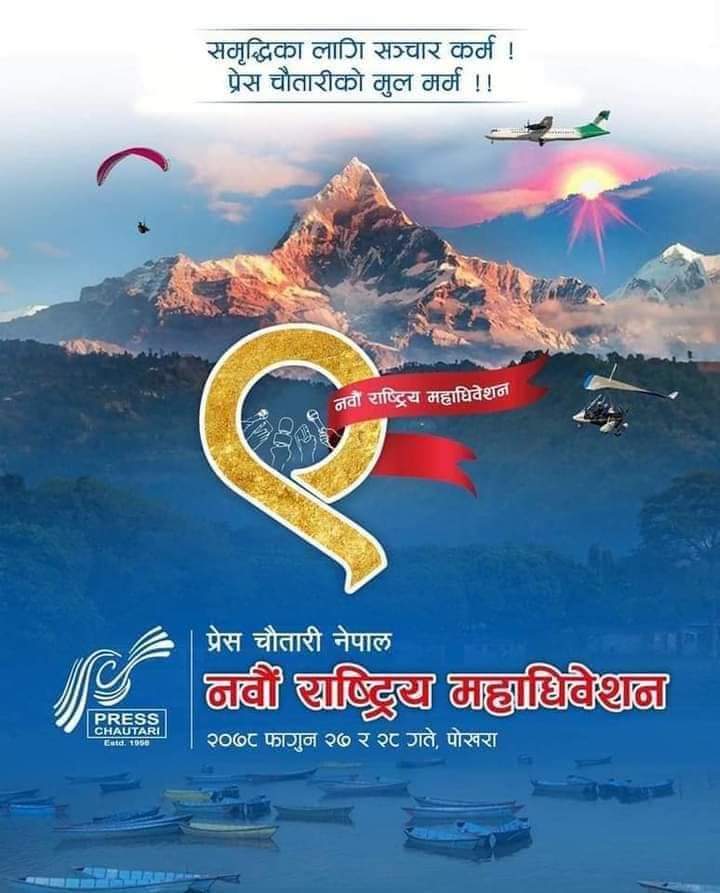 फागुन, पोखरा २६ गते ।पोखरामा आजदेखि प्रेस चौतारी नेपालको नवौं राष्ट्रिय महाधिवेशनको सुरु हुदैछ ।महाधिवेशनको सम्पूर्ण तयारी पुरा भएको छ भने प्रतिनिधिहरु पोखरा आएका छन् । भोलि शनिबार सम्म चल्ने महाधिवेशनको उद्घाटन एमाले अध्यक्ष एव पूर्वप्रधानमन्त्री केपी शर्मा ओलीले गर्ने छन् । आज ११ बजे पोखरा सभागृहमा महाधिवेशन उद्घाटन हुने छ । चौतारीको महाधिवेशन नीति र नेतृत्वको हिसाबले महत्वपूर्ण रहेको महाधिवेशन मुल व्यवस्थापन समितिका संयोजक गणेश पाण्डेले बताउनुभयो । महाधिवेशनमा अहिलेको सञ्चार क्षेत्रको मुद्दाका बारेमा गहन रुपमा छलफल हुने उहाँले जनाउनुभयो ।