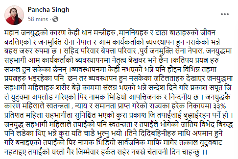 यस्तै अनेरास्ववियु क्रान्तिकारीकी अध्यक्ष पञ्चासिंहले जनमुक्ति सेना र आम कार्यकर्ताको व्यवस्थापन हुन नसकेको सही भएपनि जनयुद्धमा सहभागी महिलाहरु शरीर वेच्ने काममा संलग्न रहेको सन्देश दिने गरी गीतमा दृश्य समावेश गर्नु आपत्तिजनक रहेको बताइन् ।
