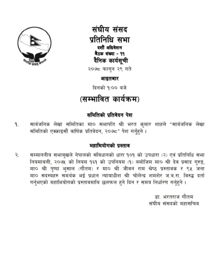 यस्तै, सभामुख अग्निप्रसाद सापकोटाले नेपालको संविधानको धारा १०१ को उपधारा (२) एवं प्रतिनिधिसभा नियमावली, २०७५ को नियम १६१ को उपनियम (१) बमोजिम देवप्रसाद गुरुङ, पुष्पा भुसाल (गौतम) र जीवनराम श्रेष्ठ प्रस्तावक र ९५ जना सांसद समर्थक भई प्रधानन्यायाधीश चोलेन्द्रशमशेर जबराविरुद्ध दर्ता गराएको महाअभियोगको प्रस्तावमाथि छलफल हुने दिन र समय निर्धारण गर्ने सम्भावित कार्यसूची छ ।