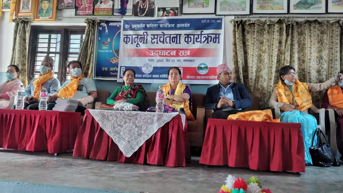कार्यक्रमको उद्घाटन गर्नु हुदै प्रमुख अतिथि पोखरा महानगरपालिकाका उपमेयर मञ्जुदेवी गुरुङले कानुनी अज्ञानताले धेरै समस्या झेल्ने परिरकेकाले महिला, आमा, दिदिबहिनी मात्रै नभई बाबा, दाजुभाईहरुमा पनि कानुनी सचेतना जरुरी रहेको बताउनुभयो। कानुनी अज्ञानता क्षम्य नहुने भएकाले व्यहारिक, प्रथाजनित, विधि विधान, ऐन, कानुुनदेखि संविधान सबै नागरिकले बुझ्नुपर्ने उहाँको भनाई थियो। कानुनी सचेतना तालिमले कानुनी ज्ञान, हामीलाई परिआउने समस्या पहिचान र उन्मुक्तिका लागि मार्ग देखाउन सक्षम हुने बताउनुभयो।उहाँले महिला शसक्तिकरणका लागि वडाहरुमा महिला प्रतिभाकोष स्थापना गरिएकाले उक्त कोषबाट तालिम माग गर्न सकिने बताउनुहुदै आफुले आमा दिदिबहिनीको क्षमता अभिवृद्धि, सशक्तिकरण र व्यवसायिकताका लागि सक्दो सहयोग गर्ने बताउनुभयो।